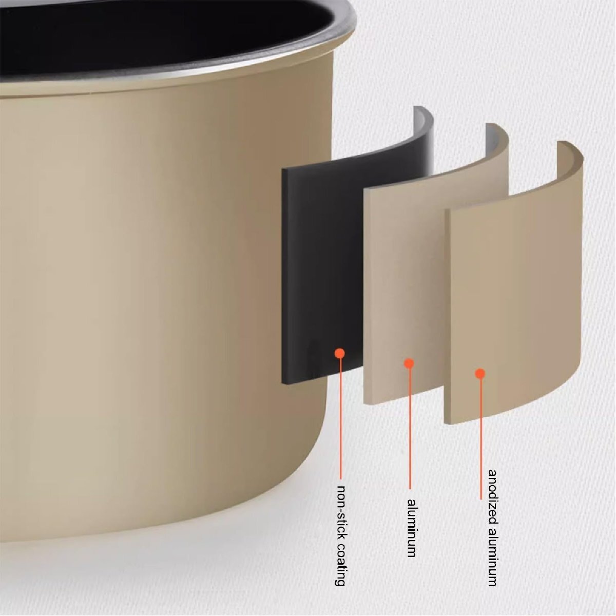 本体の材質は硬質アルミで作られ、熱伝導率が速くし、調理時間も短くなりました。持ち手はppシリコン製ハンドルのため、金属と比べ断熱性と滑り止め機能により使いやすいです。アウトドアクッカーの際には、火傷の防止可能です。鍋はノンスティック加工を施しており、拭き取るだけで汚れや焦げ付きを落としやすいです。