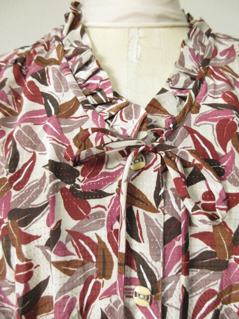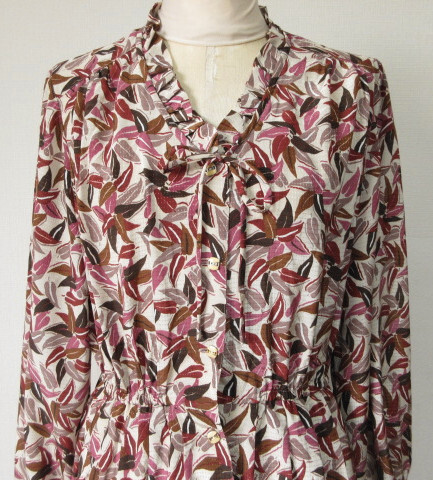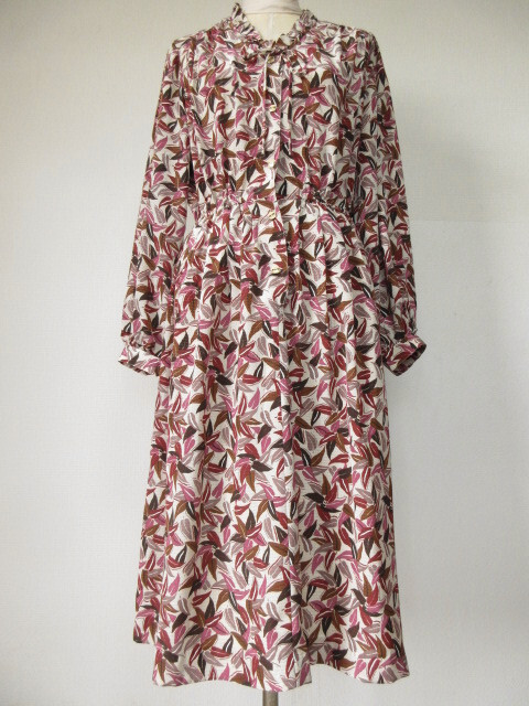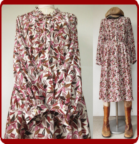 古着♪レトロ・Vintageベージュピンクボタニカル柄モッズワンピ♪70s60s70年代60年代ヴィンテージ昭和長袖秋冬大きめ15号即決ヨーロッパ