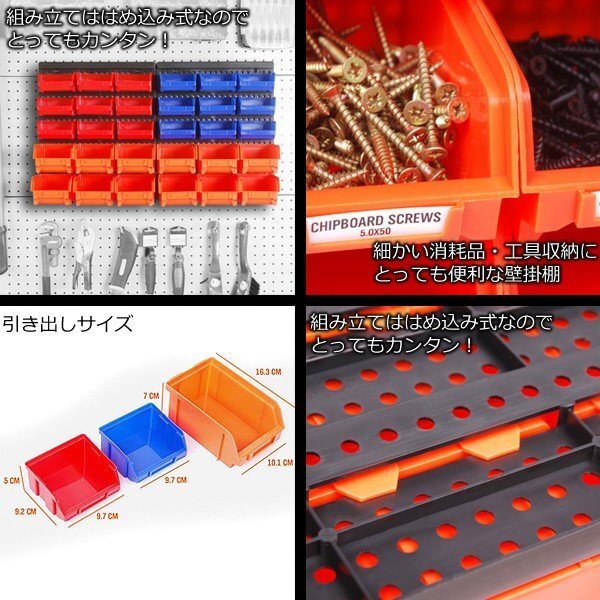 | 商品説明 | 部品収納ケース 30ピース ツールボックスキャビネット 5段6列[大12個・小18個、計30個]の小物収納カラーボックス 引き出しが小さく多くのパーツを細かく仕分けることが可能 ネジ・ボルトなどがサッと取り出せて、分かりやすい 便利な壁掛タイプ 組み立てははめ込み式なので簡単です 【商品詳細】 全体サイズ:(約)W64×H38×D18.5cm トータル重量:2kg 赤(外寸):約W9.7×H5×D9.2cm 赤(内寸):約W8.4×H4.4×D7.7cm 青(外寸):約W9.7×H5×D9.2cm 青(内寸):約W8.4×H4.4×D7.7cm 橙(外寸):約W10.1×H7×D16.3cm 橙(内寸):約W8.5×H6.8×D14.2cm この他、人気の、半分が工具ホルダーになっている43PCタイプも出品中ですのでご覧ください |