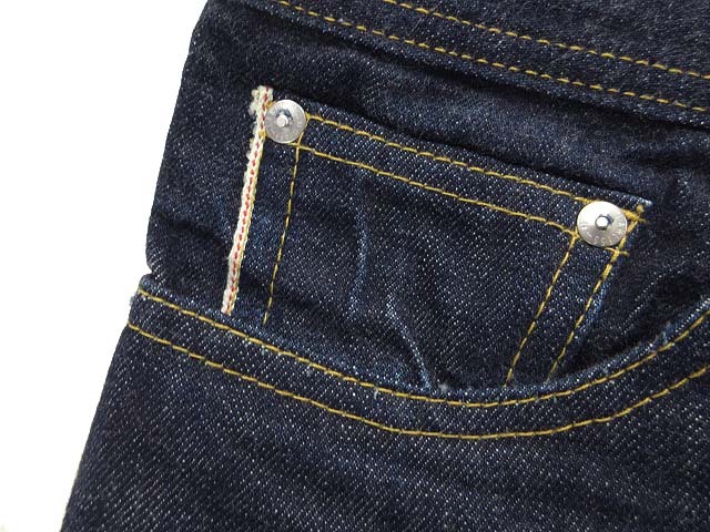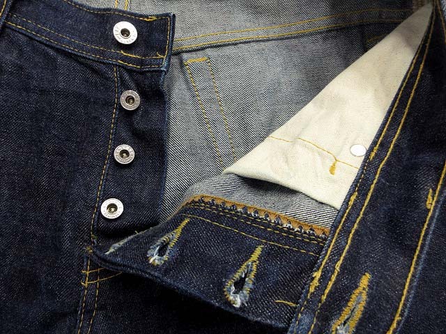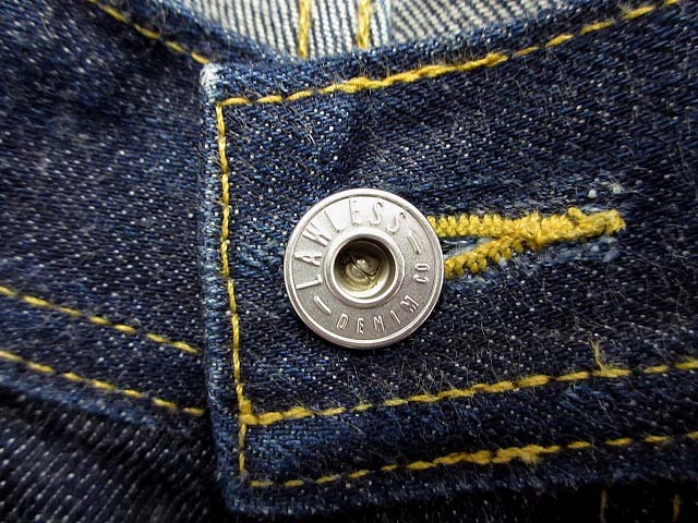 【仕様】LAWLESS DENIM CO テーパードデニムパンツ ボタンフライ、ウォッチポケット横とフロントボタン裏の生地に耳付き