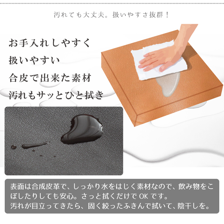 ・PUレザーは、水をはじく素材です。汚れが目立ってきたら、固く絞ったふきんで拭いて陰干ししてください。 | |