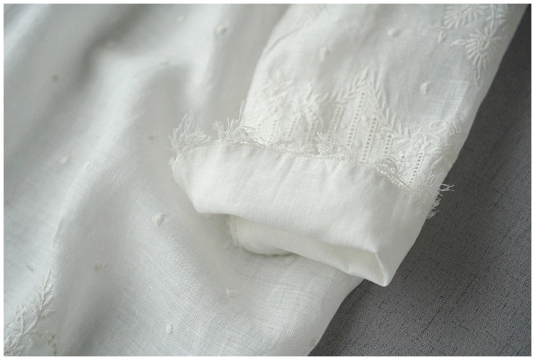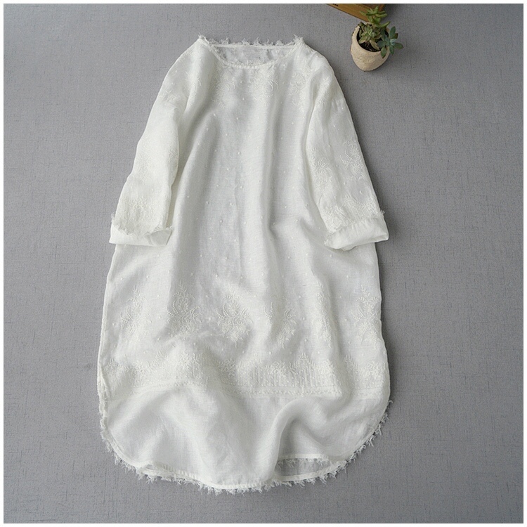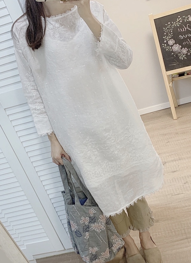 リネン100%素材、素敵な総刺繍シンプルな長袖ワンピース♪