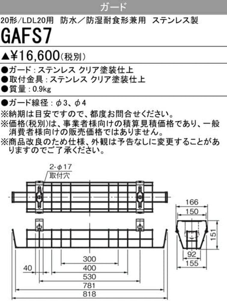 LED施設照明器具用ガード 防湿防雨形 ステンレス製 Myシリーズ20形用 5個入 三菱 GAFS7-05