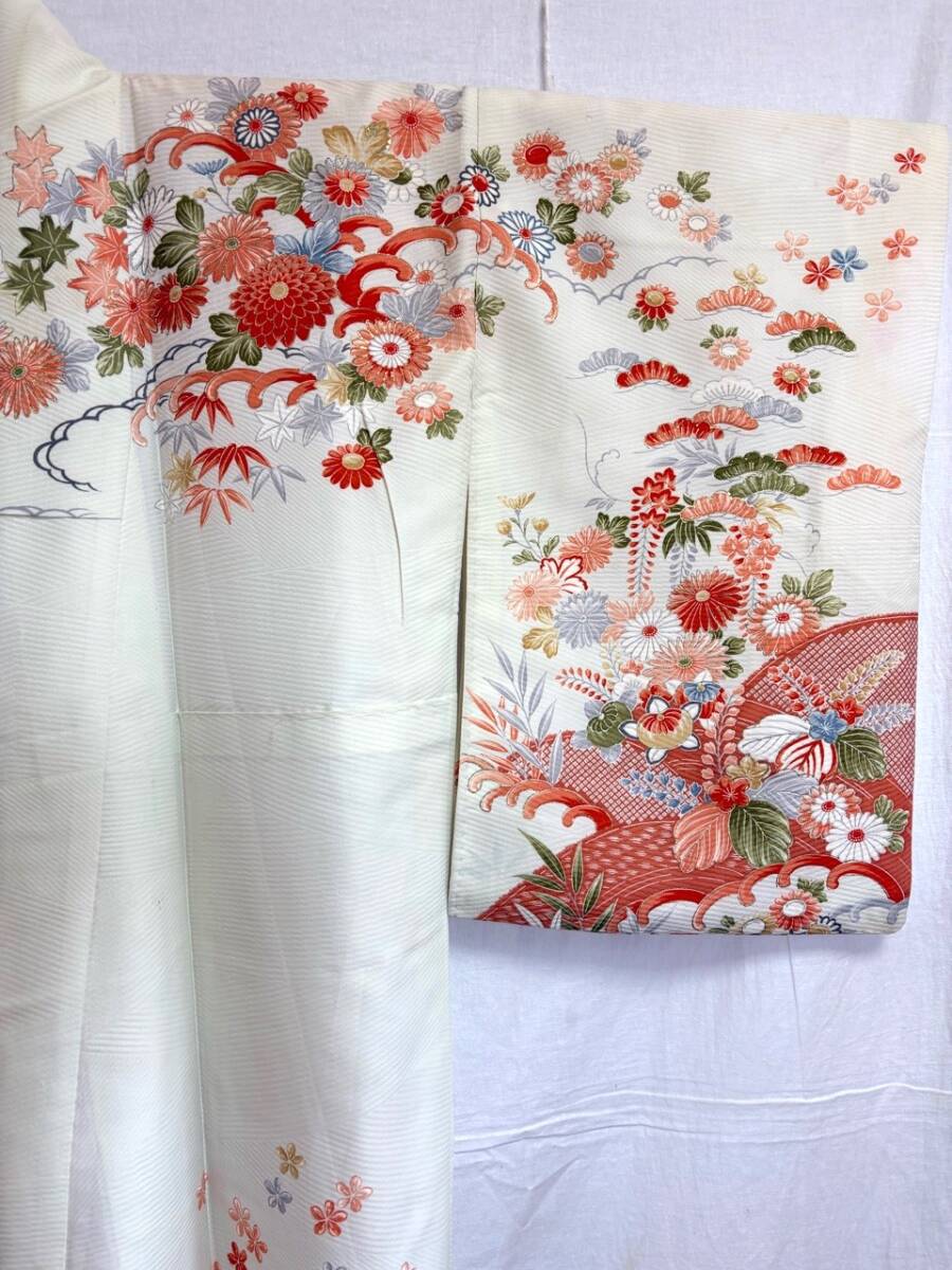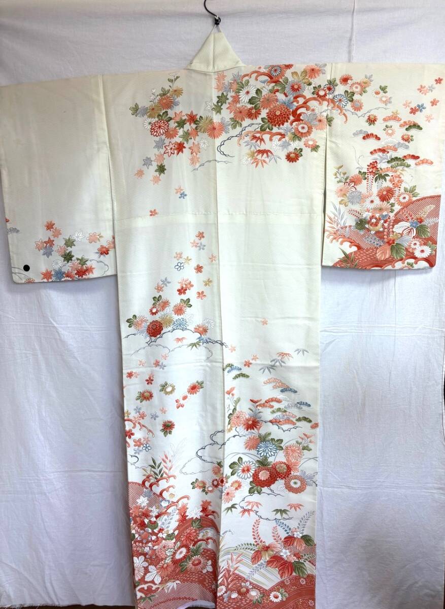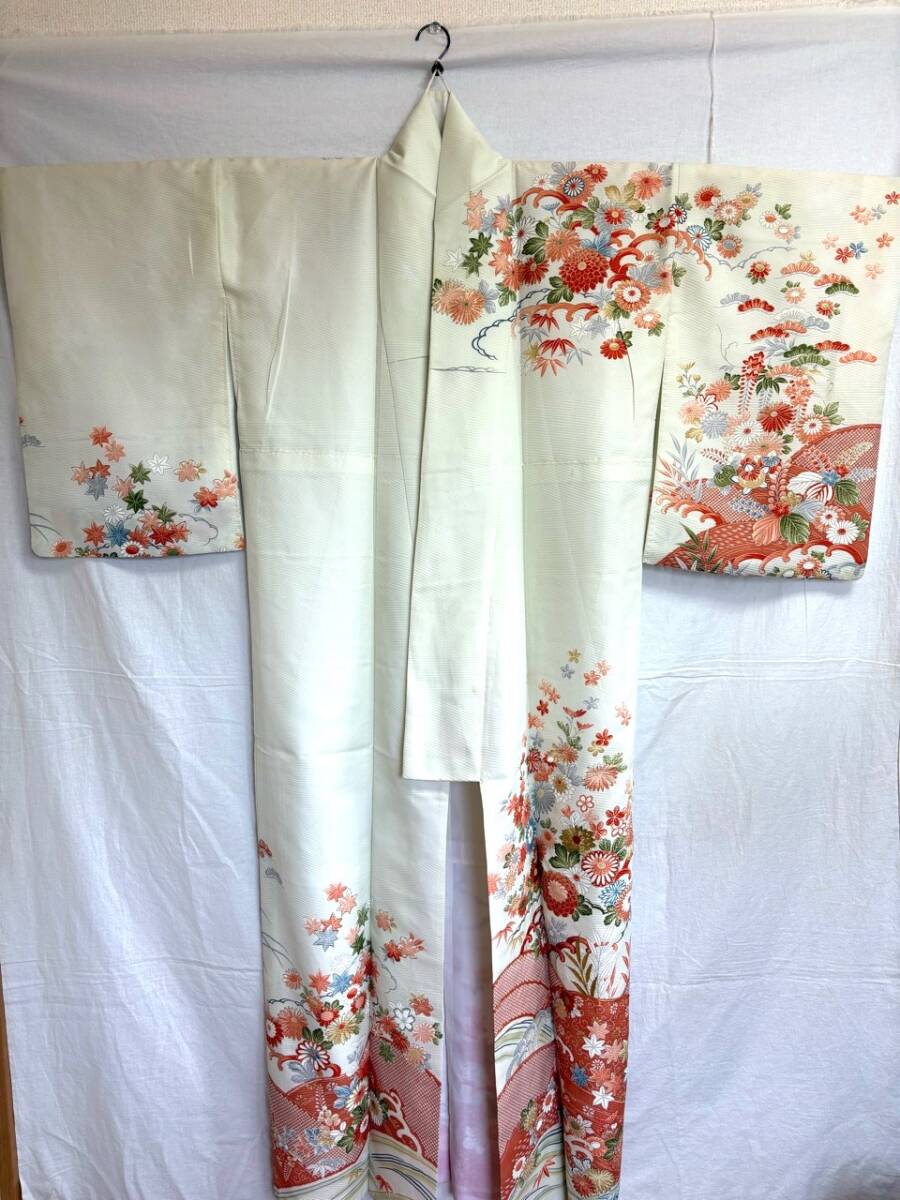 0029★着物*白*オフホワイト*花*柄*身丈157cm*和装*和服*和柄*モダン*レトロ*アンティーク*女性*レディース*お得★