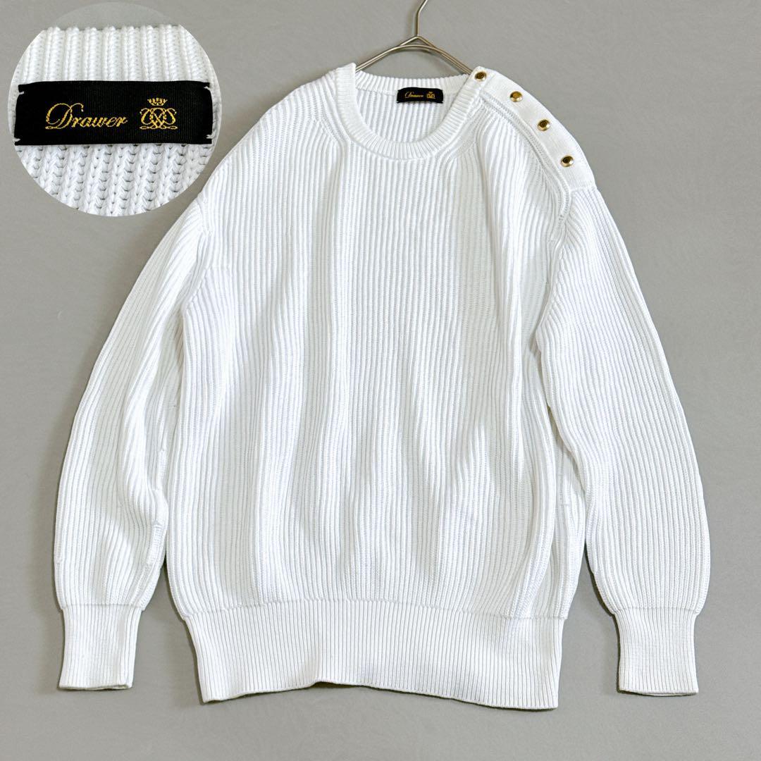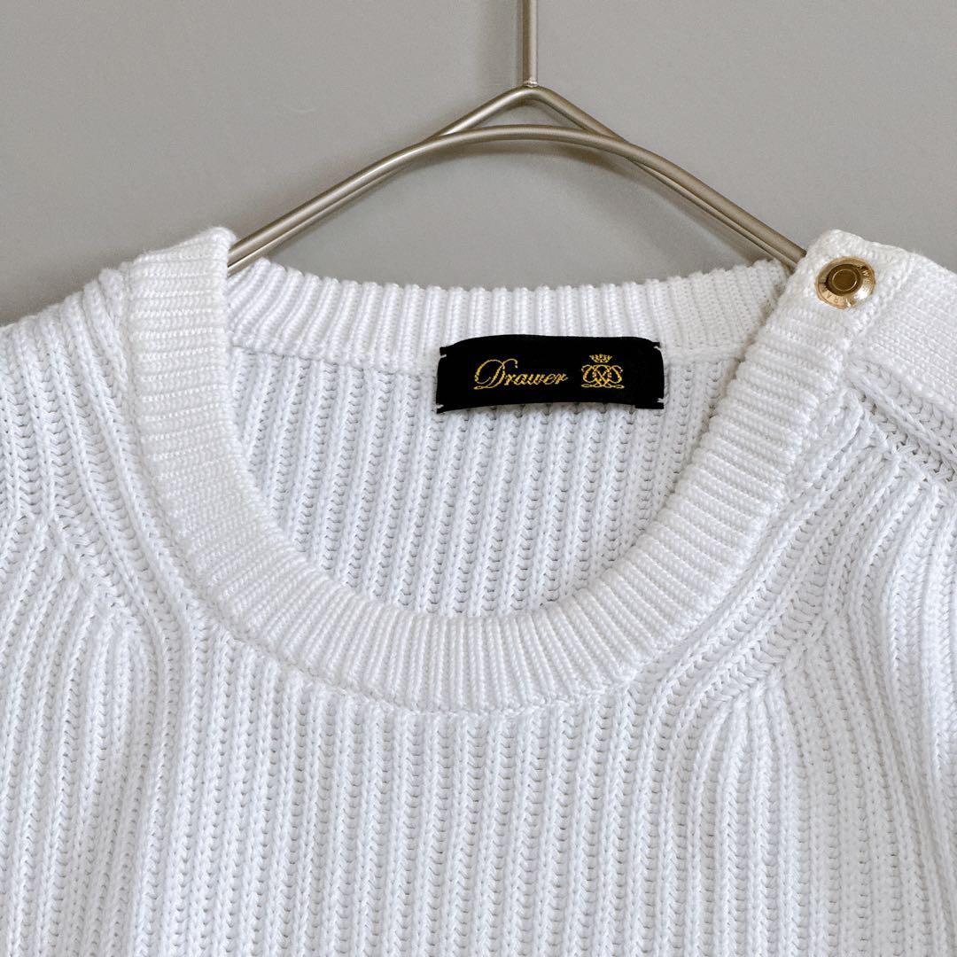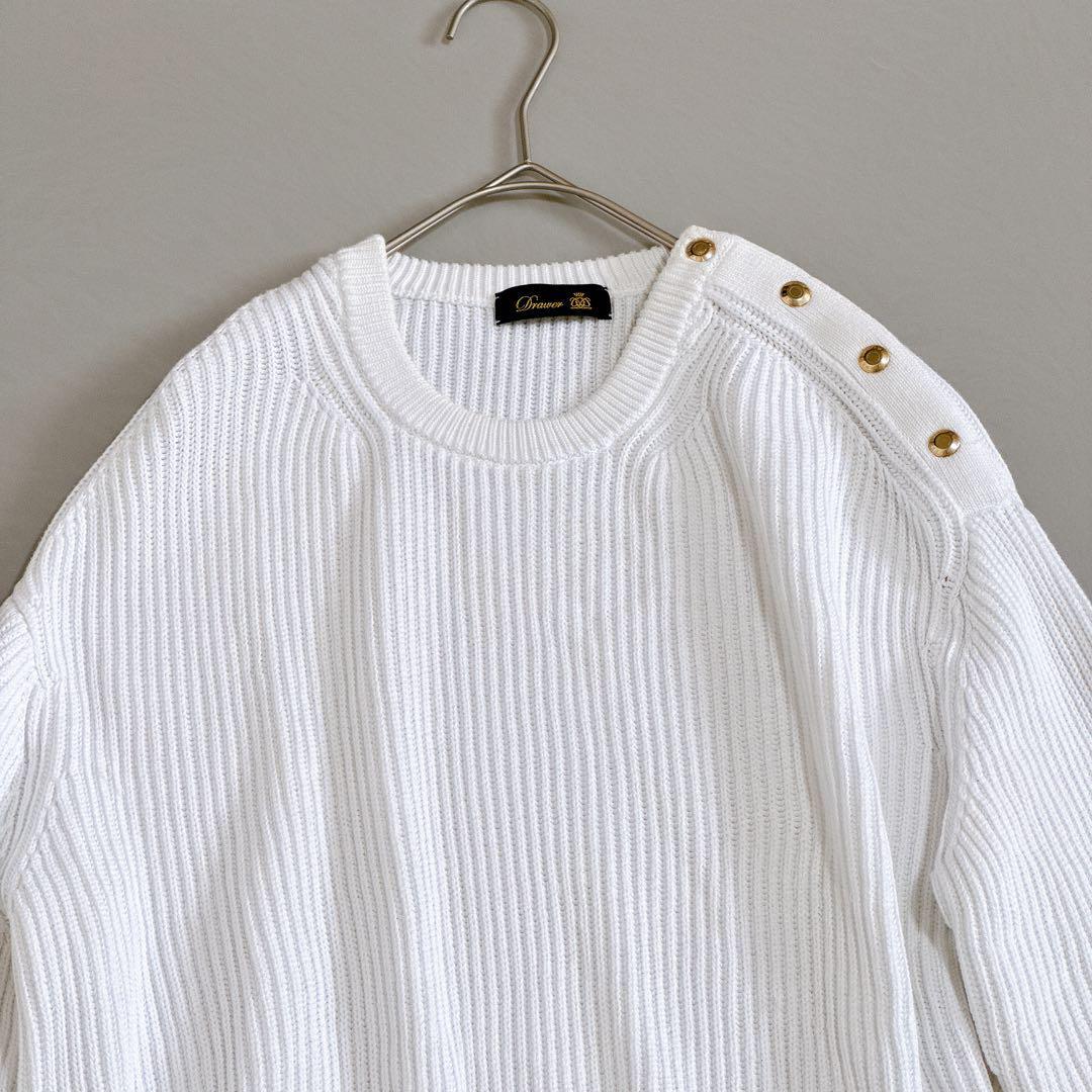 ドゥロワー DRAWER スナップボタン ゴールド金具 クルーネック 白ニット 畔編み コットン 春服 長袖ニット レディース トップス カジュアル 上品 きれいめ