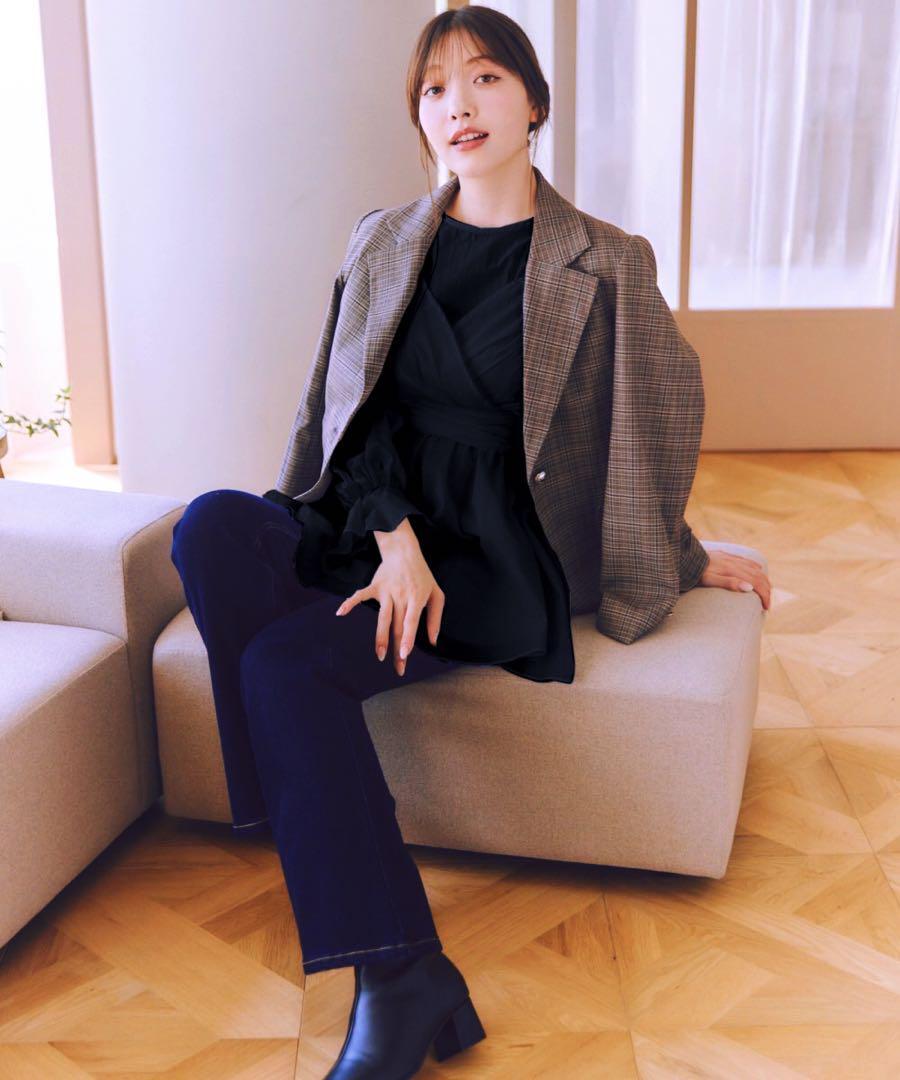ショート丈のカーディガンやアウターを合わせて、ペプラム部分を覗かせるコーディネートがお勧めです。