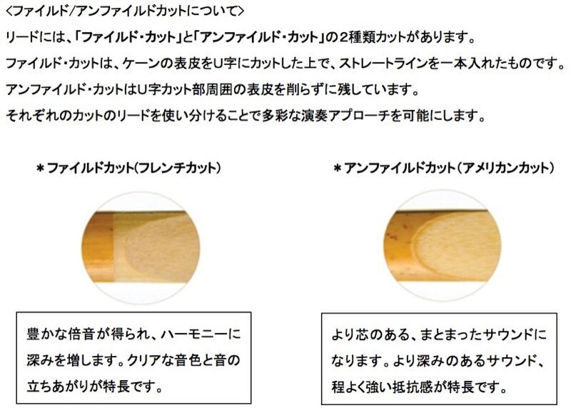ジャズセレクトの特徴は、くっきりした硬めのハートと長めのヴァンプ。このカットが、今までにない抜群のプロジェクションとを生み出し、さらに、優れた柔軟性と素早いレスポンスを実現します。高品質のケーンを使用しており、ばらつきなく、耐久性に優れています。 ファイルド・カット(フレンチ・カット)とアンファイルド・カット(アメリカン・カット)の2種類から選ぶことができ、また、各強度もソフト/ミディアム/ハードと3段階に分かれており、好みに合わせてより細かく選ぶことができます。