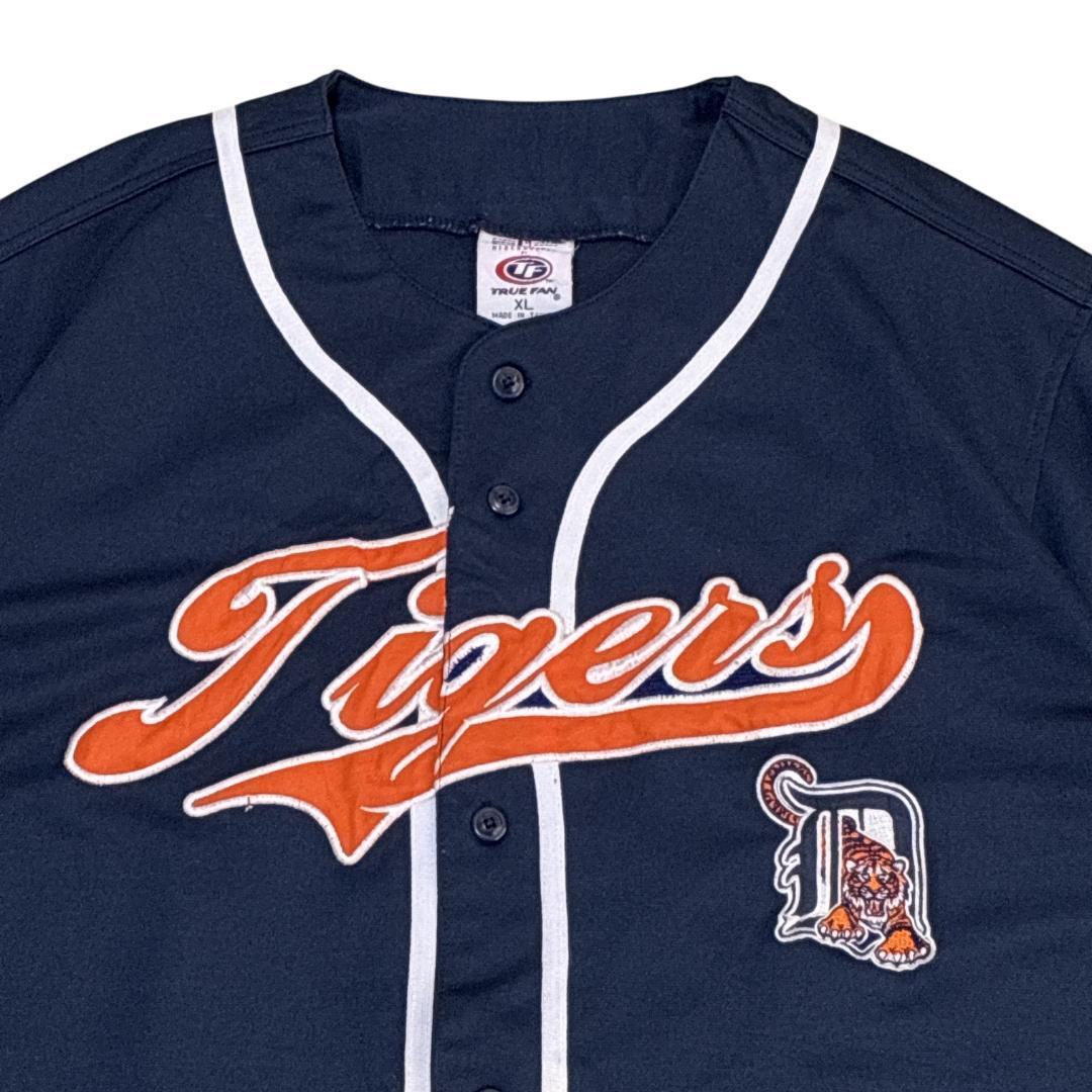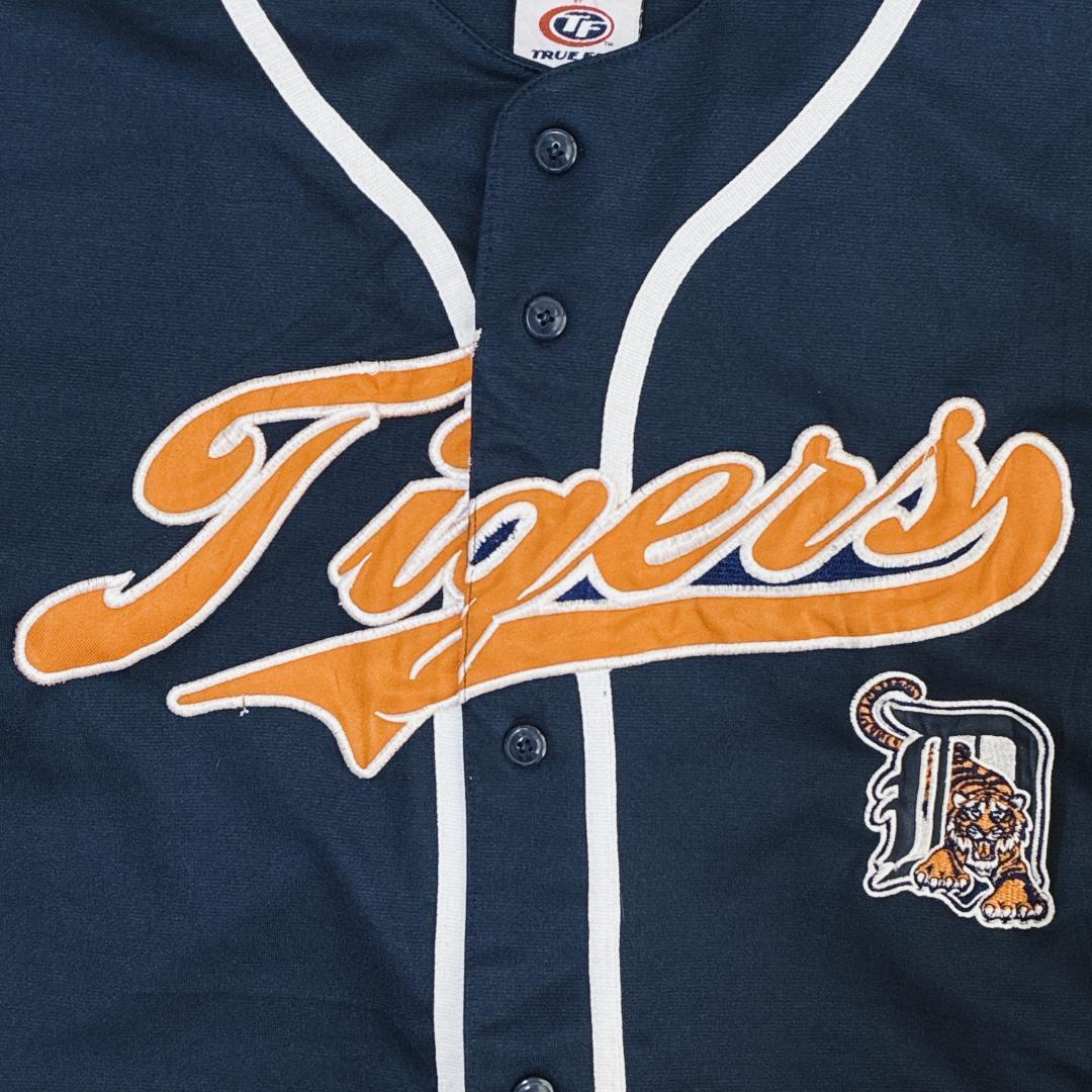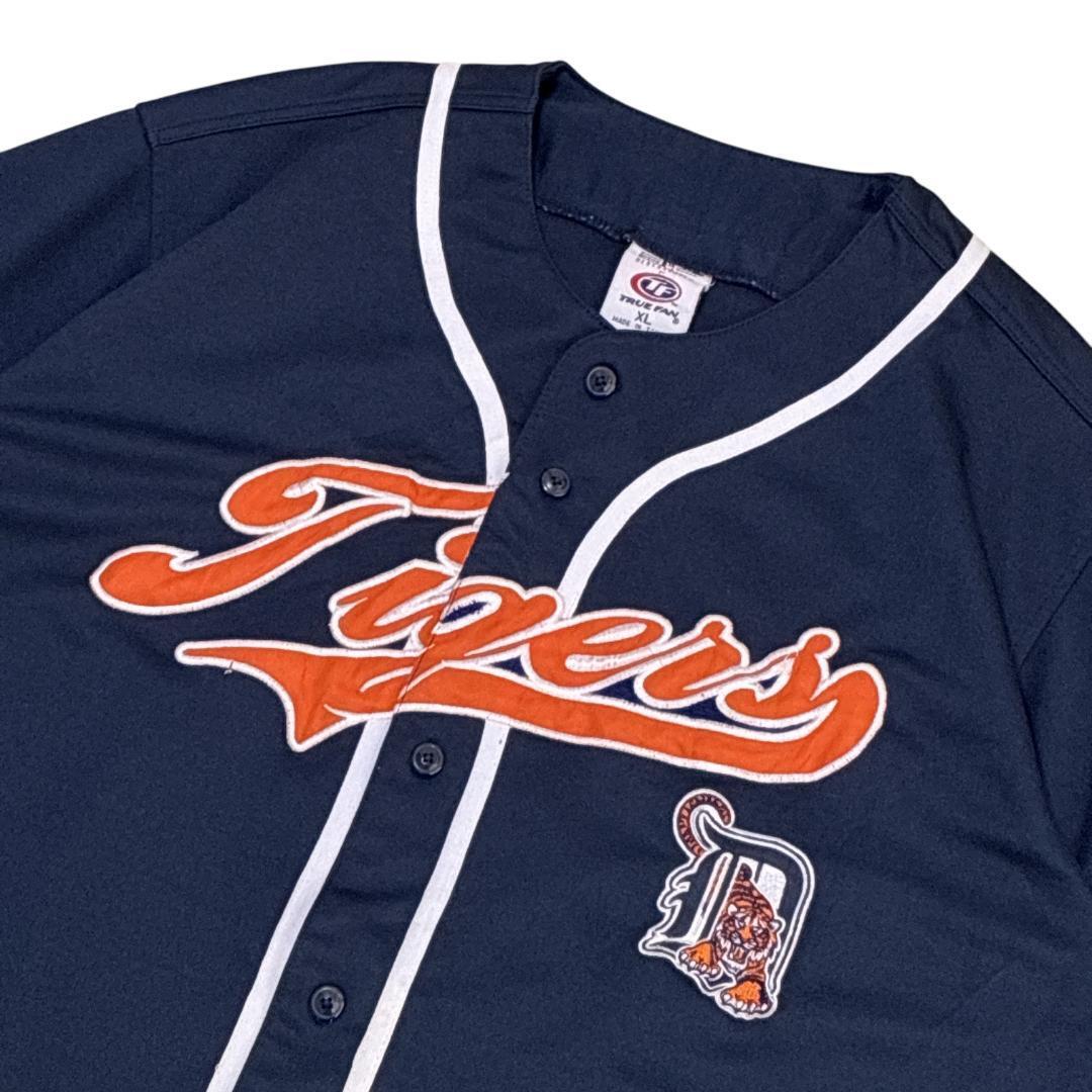MLBタイガース TRUE FANトゥルーファン 刺繍ロゴ ベースボールシャツ ゲームシャツ ユニフォーム 2XL 紺色 90s 古着 メジャーリーグ