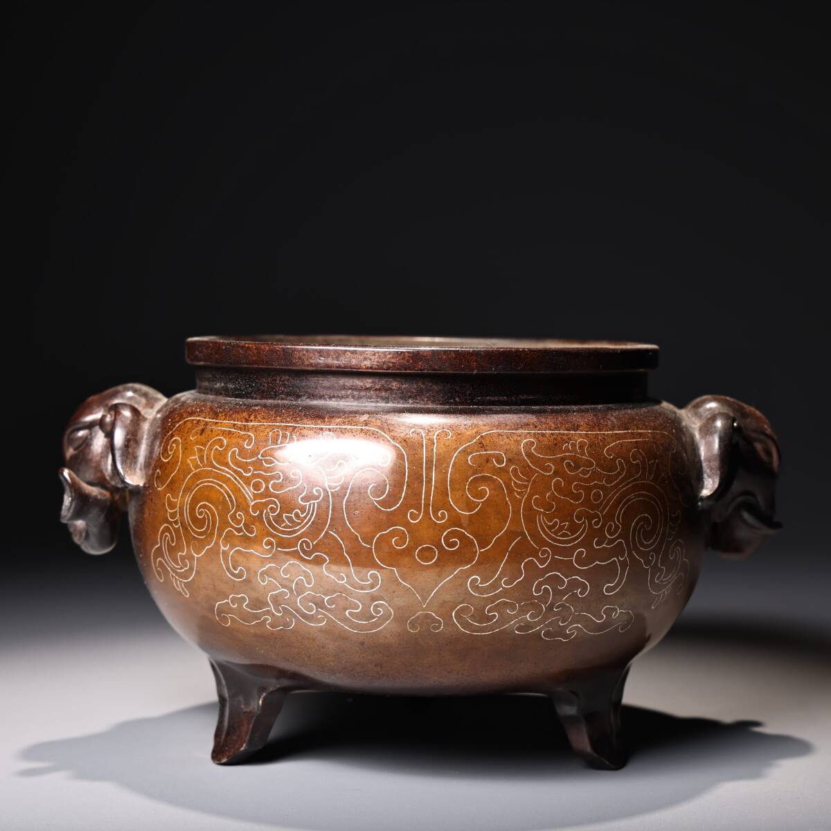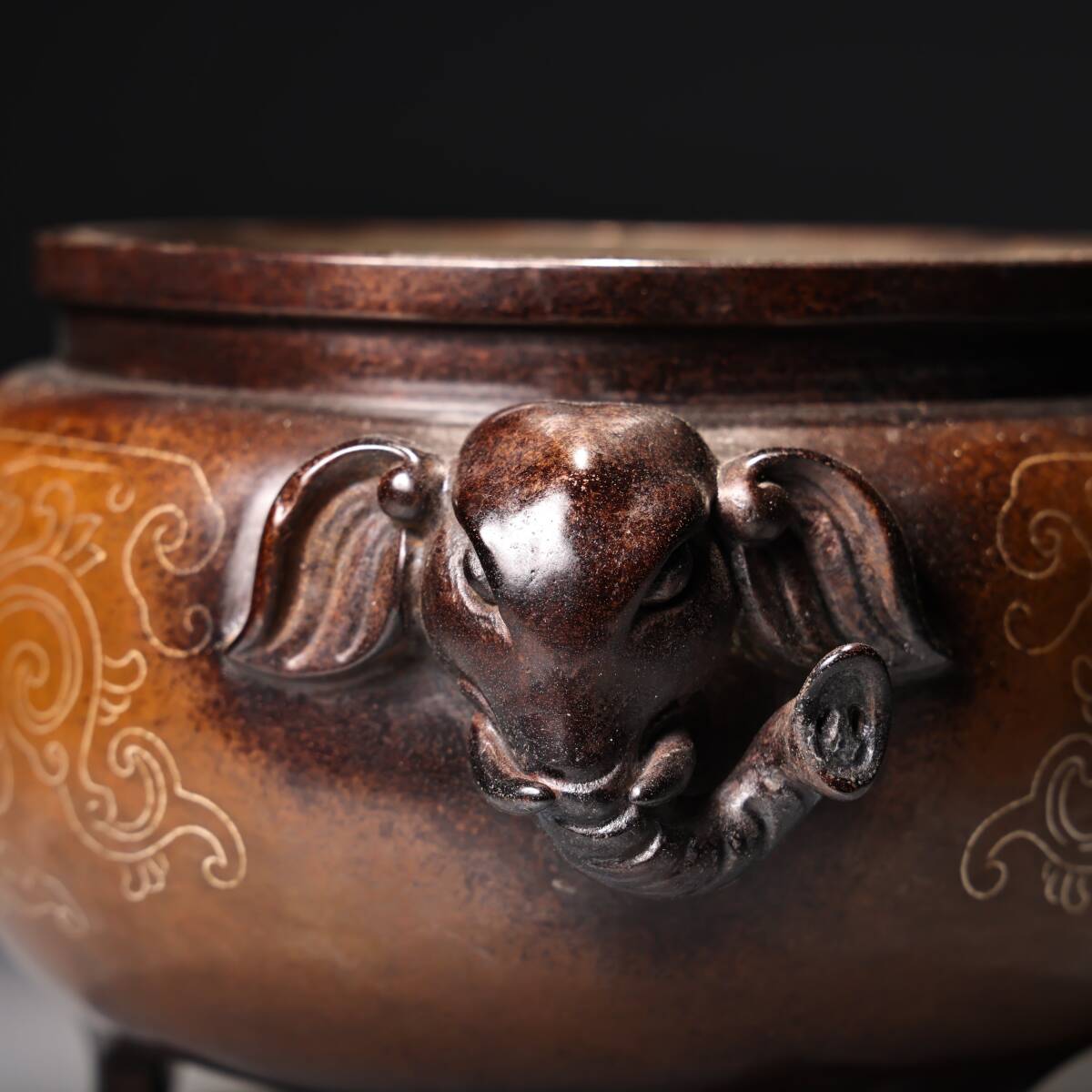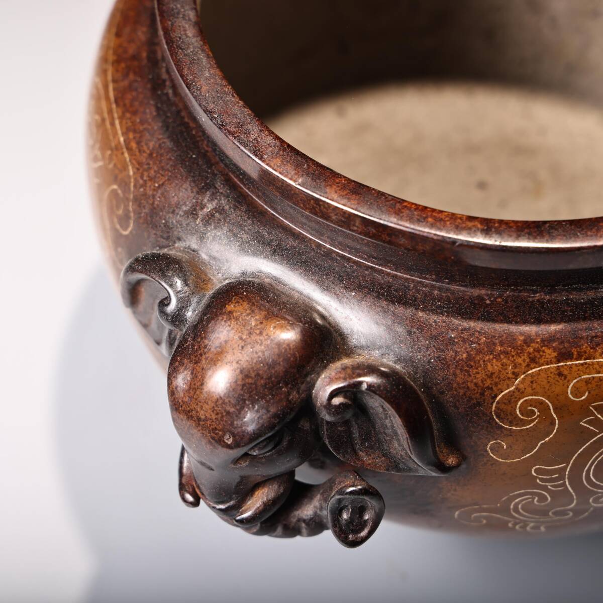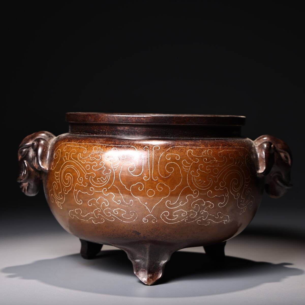 *珍品旧蔵* 清 純銅 紫銅 高浮彫 鏨刻工藝 モザイク銀絲 象耳香炉 香道具 銅製品 銅器 極細工 中国古玩 骨董品 古美味 H45