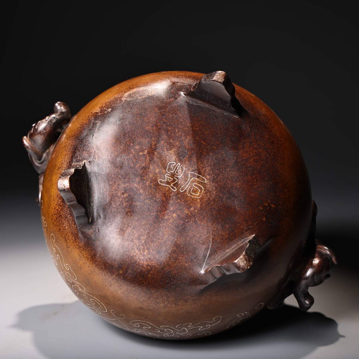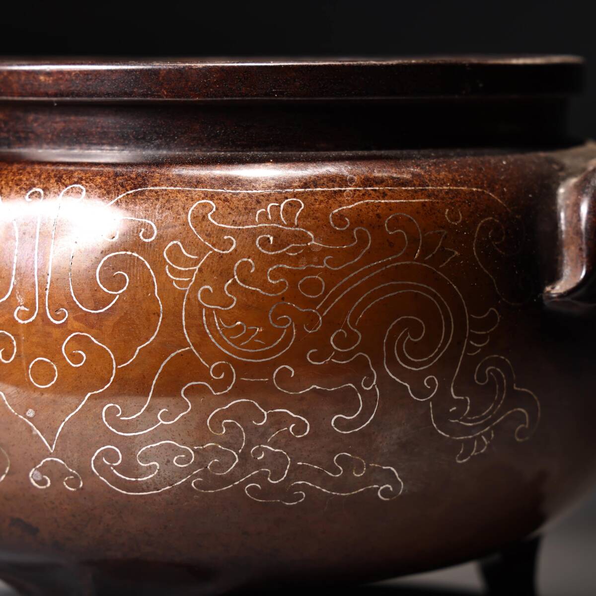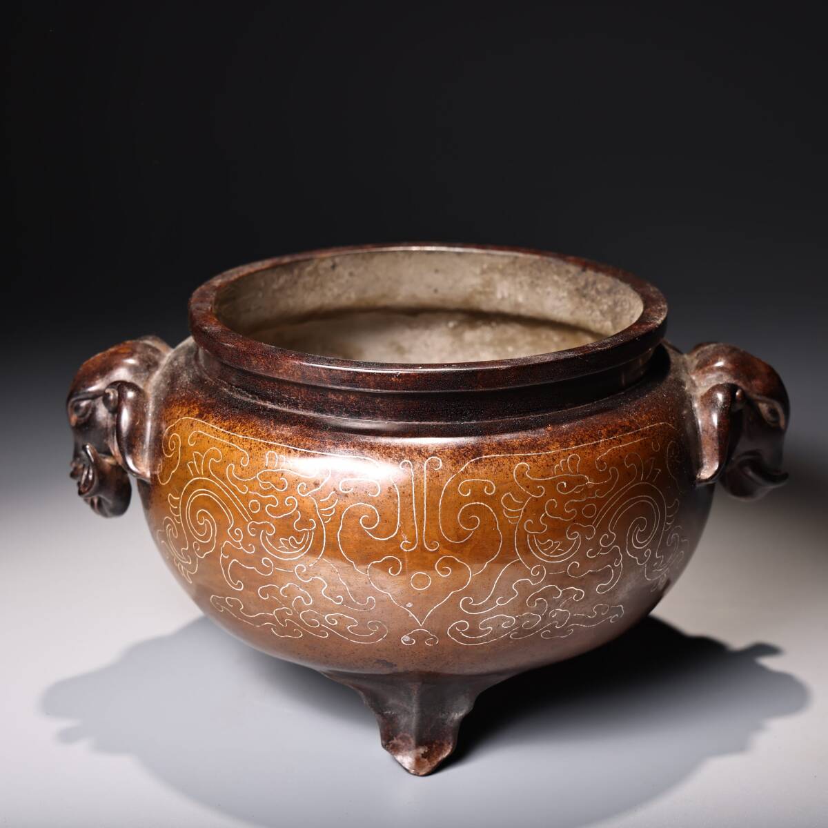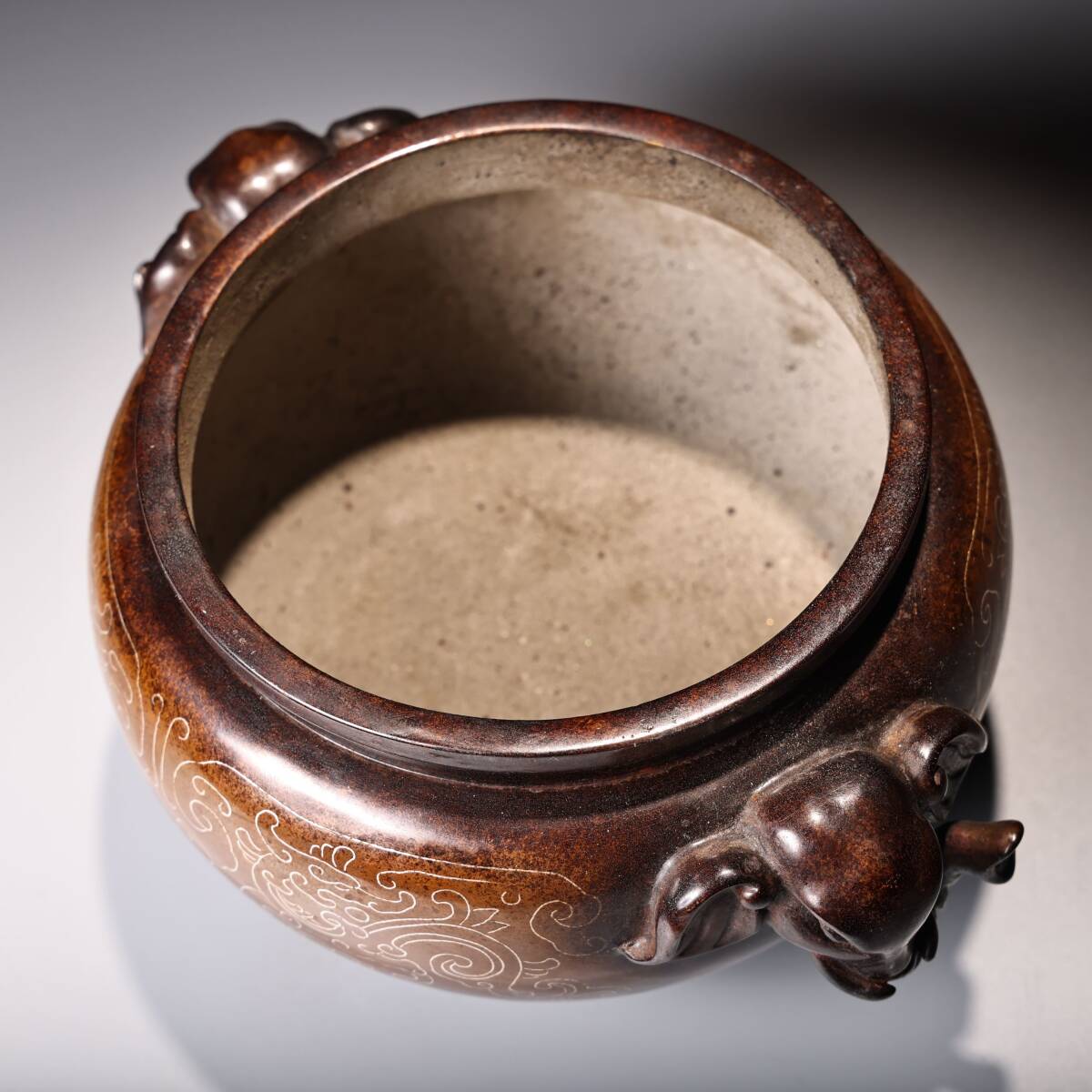 *珍品旧蔵* 清 純銅 紫銅 高浮彫 鏨刻工藝 モザイク銀絲 象耳香炉 香道具 銅製品 銅器 極細工 中国古玩 骨董品 古美味 H45