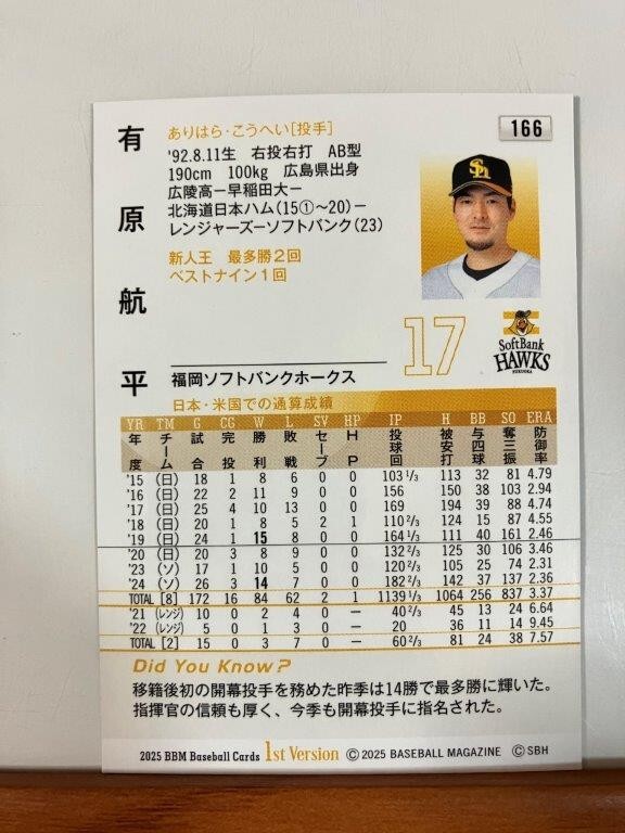 【2025 BBM 1st】166有原航平(福岡ソフトバンクホークス)レギュラーカード※キラカード版