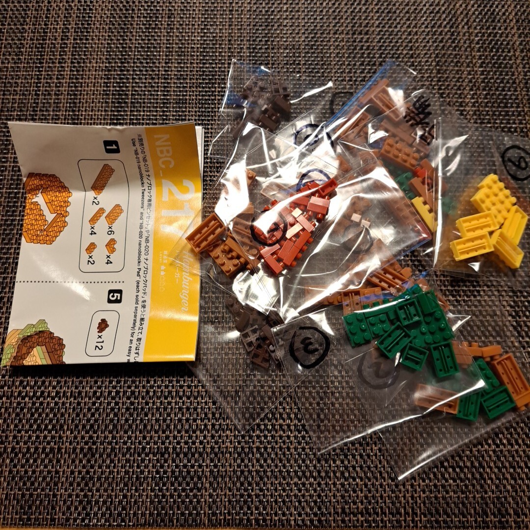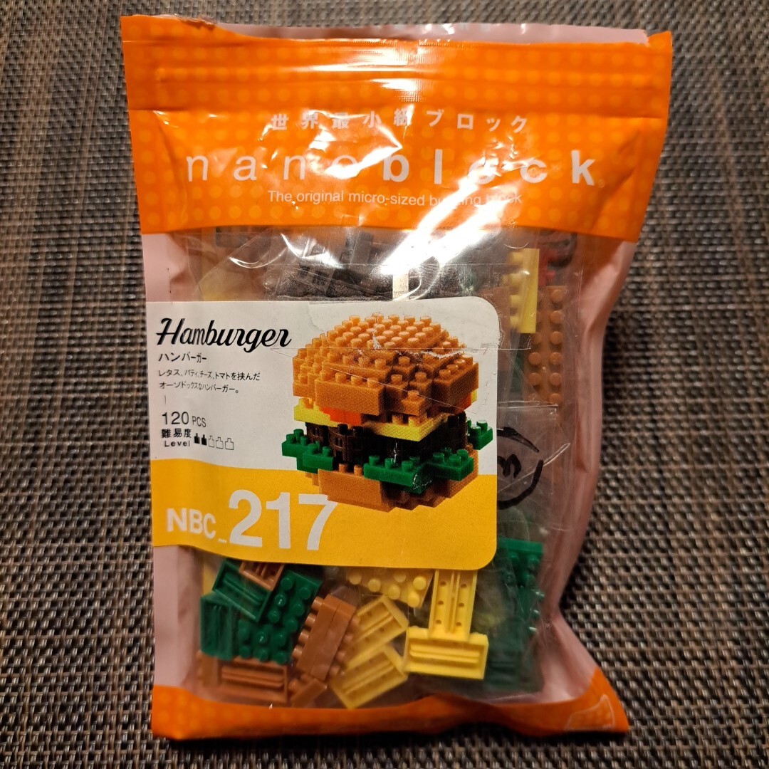 Kawada【nanoblock】ハンバーガーver.です。パッケージのハンバーガーシール部分が破れてしまったので、セロテープでとめてあります。部品の数を確認してあります。