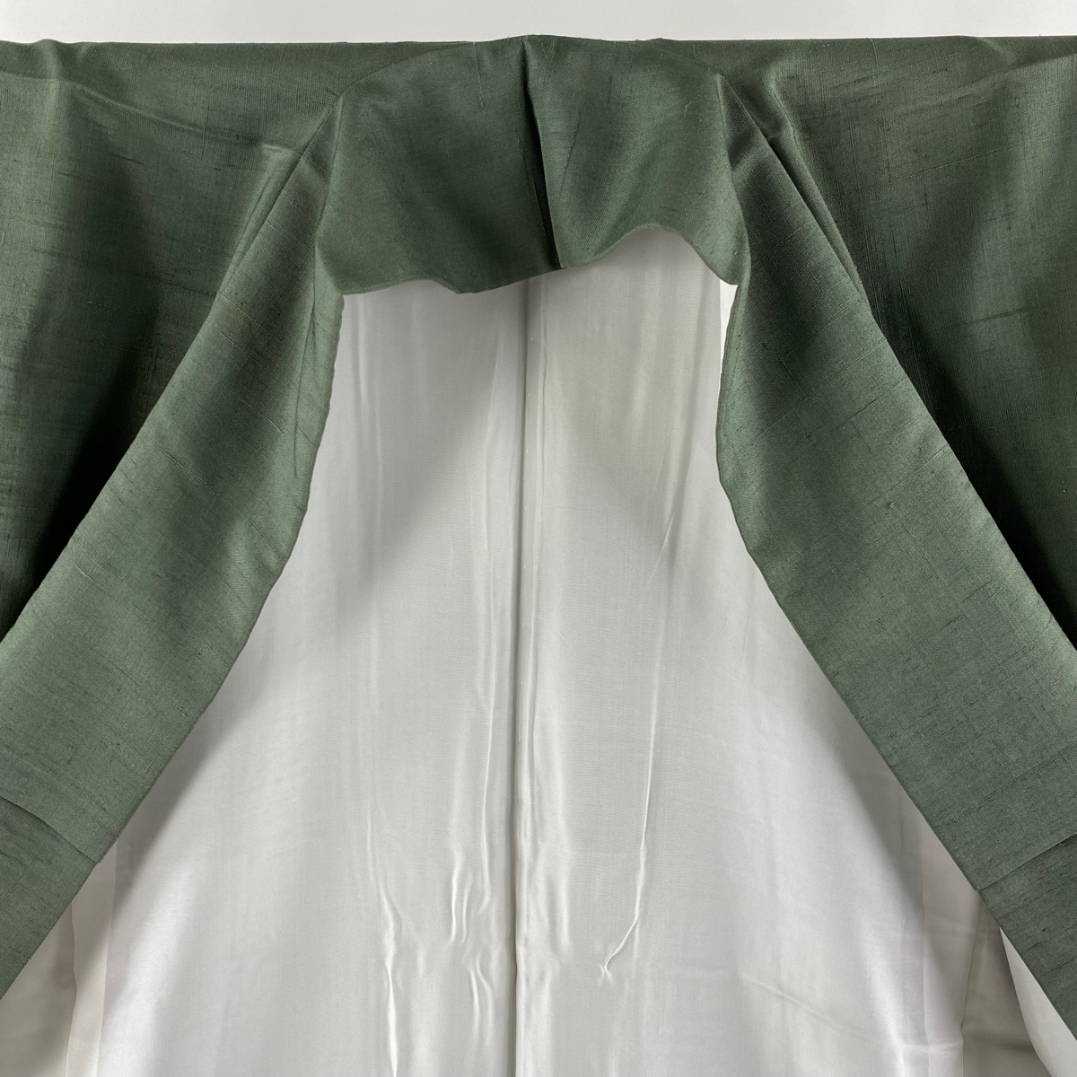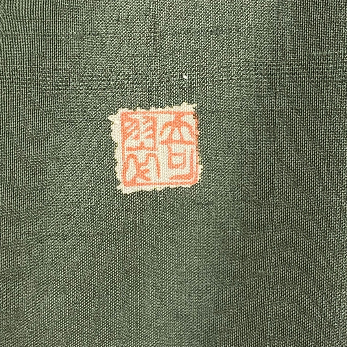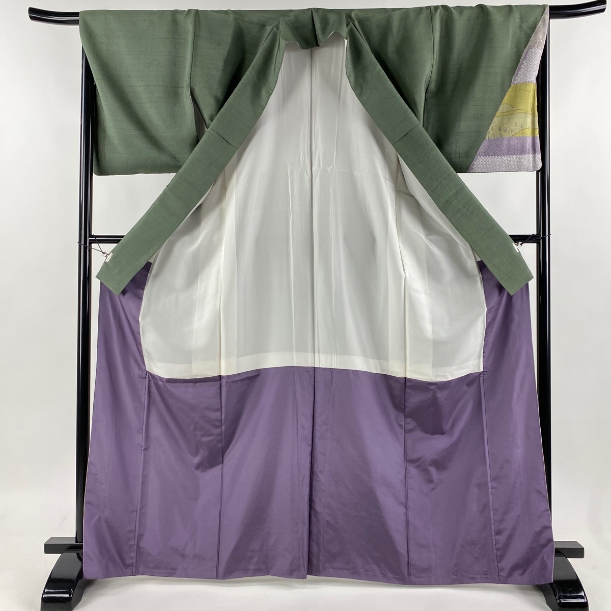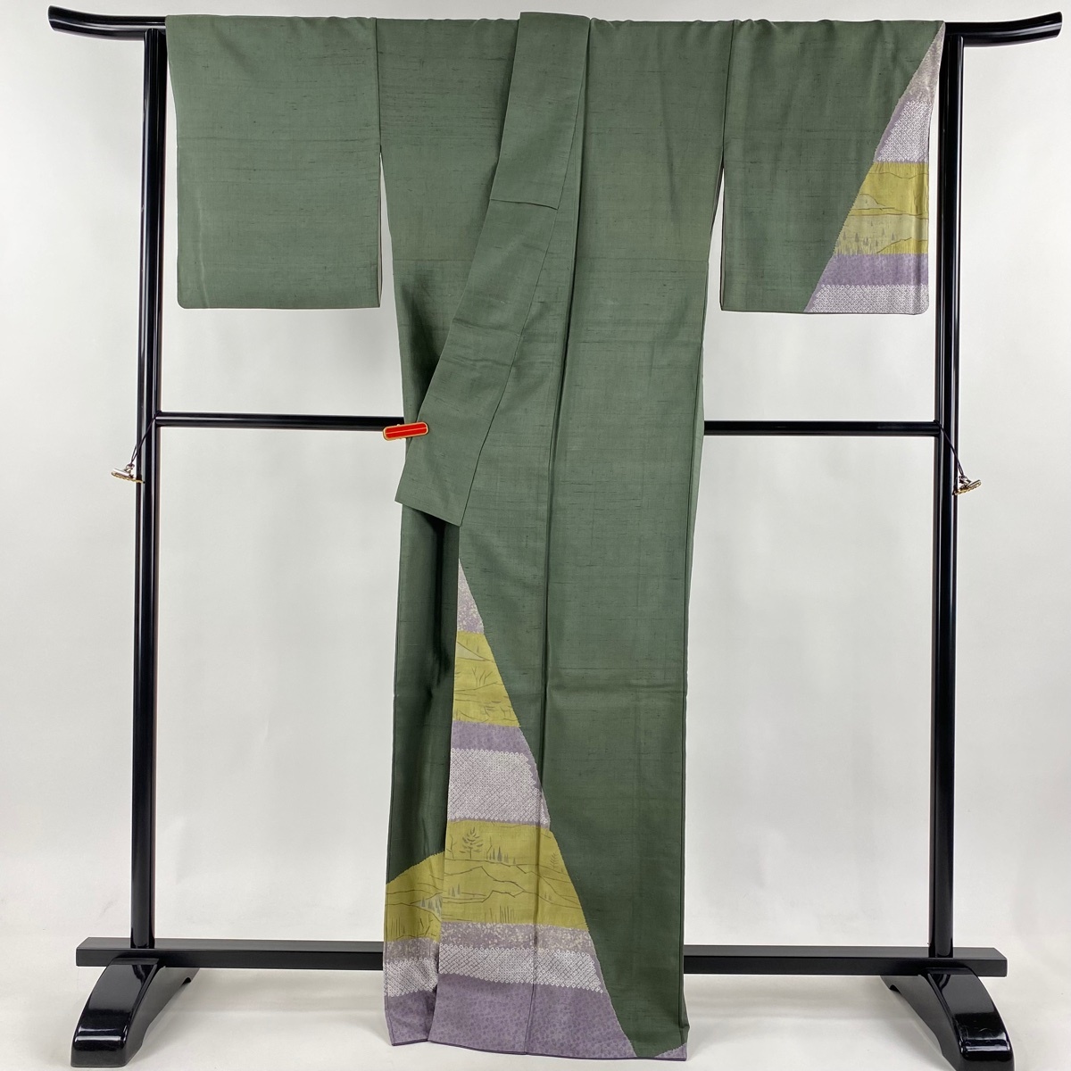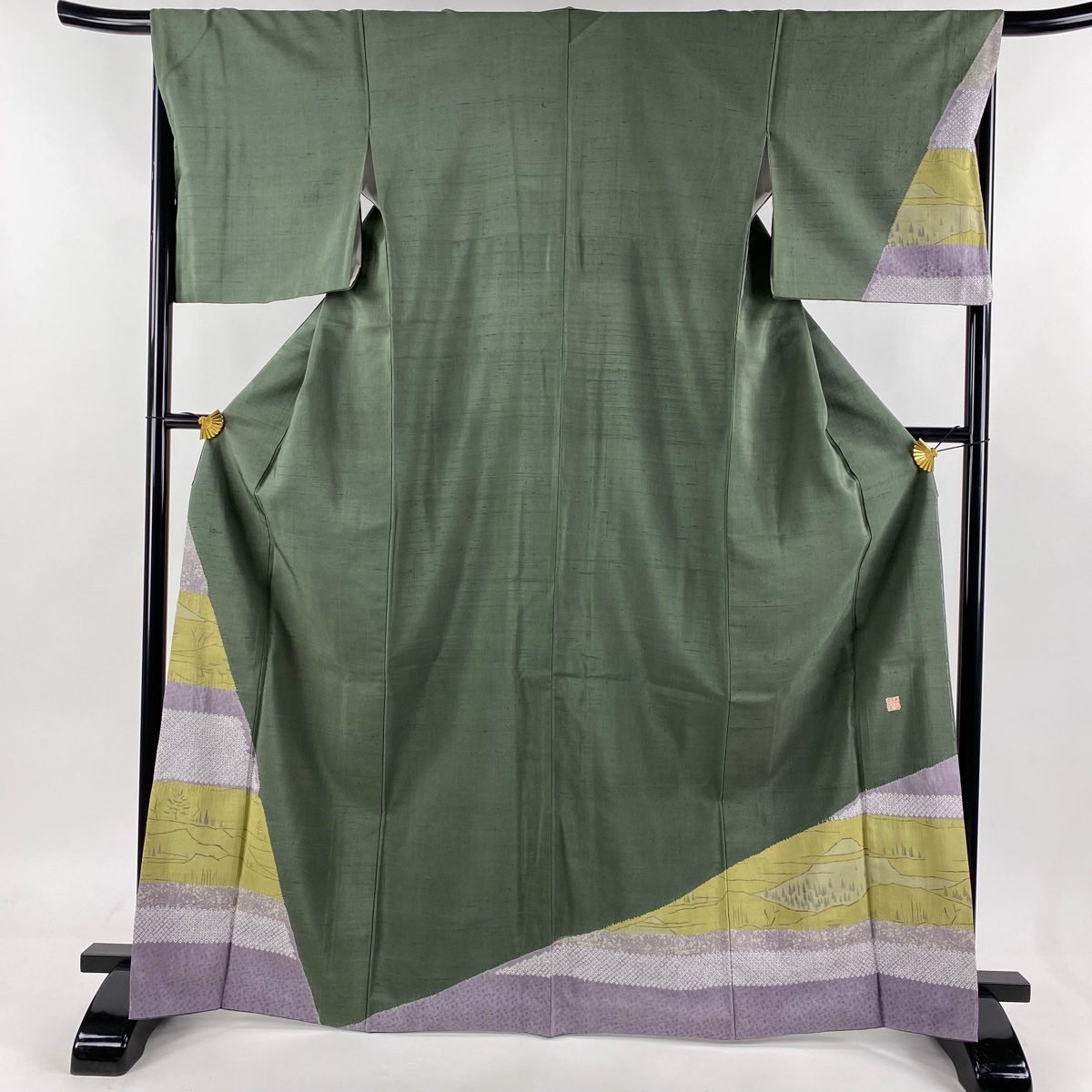 | 付下げ 逸品 落款 紬地 奇翠 樹木 笹蔓 絞り 深緑 袷 身丈168.5 裄丈67.5 L 正絹 【中古】 |
