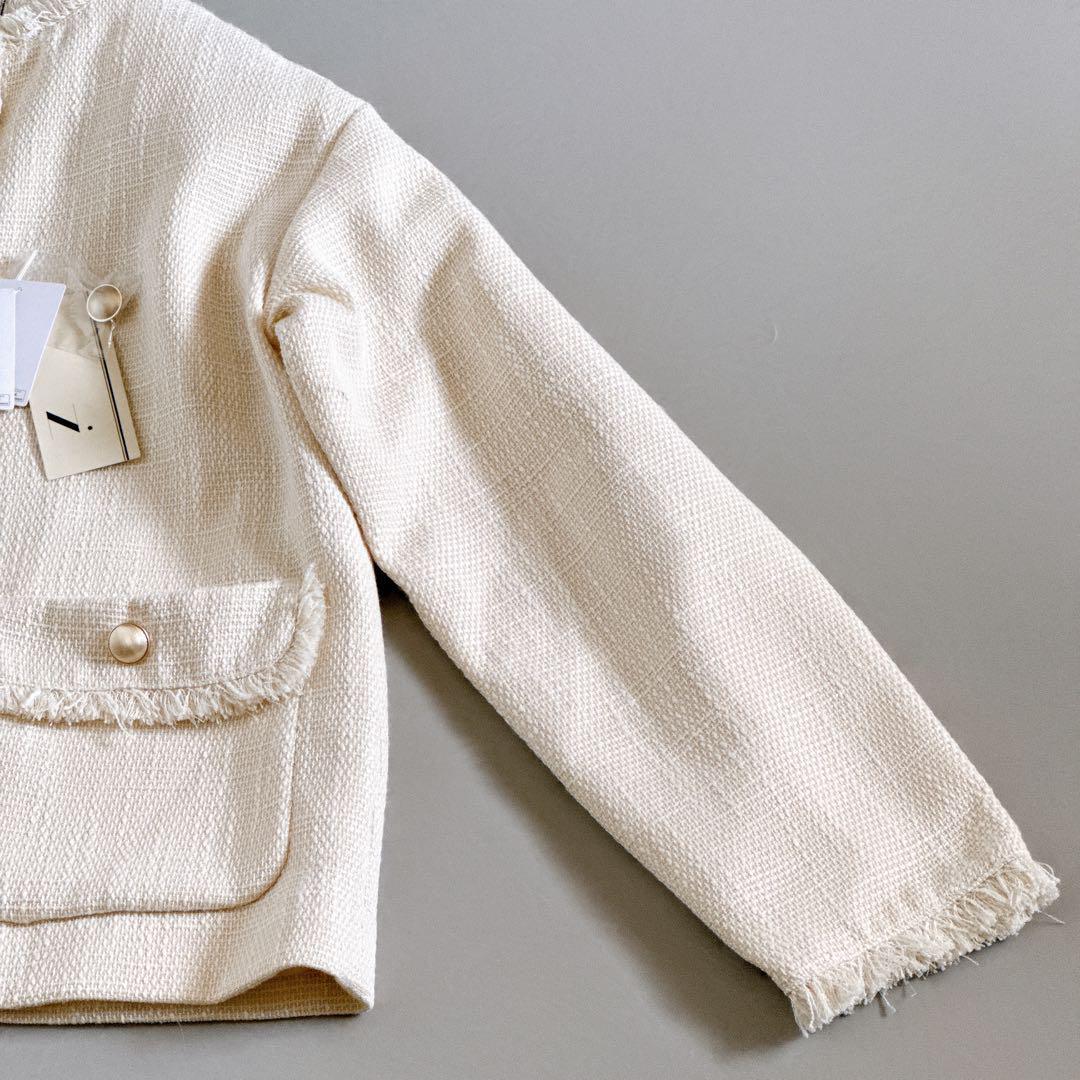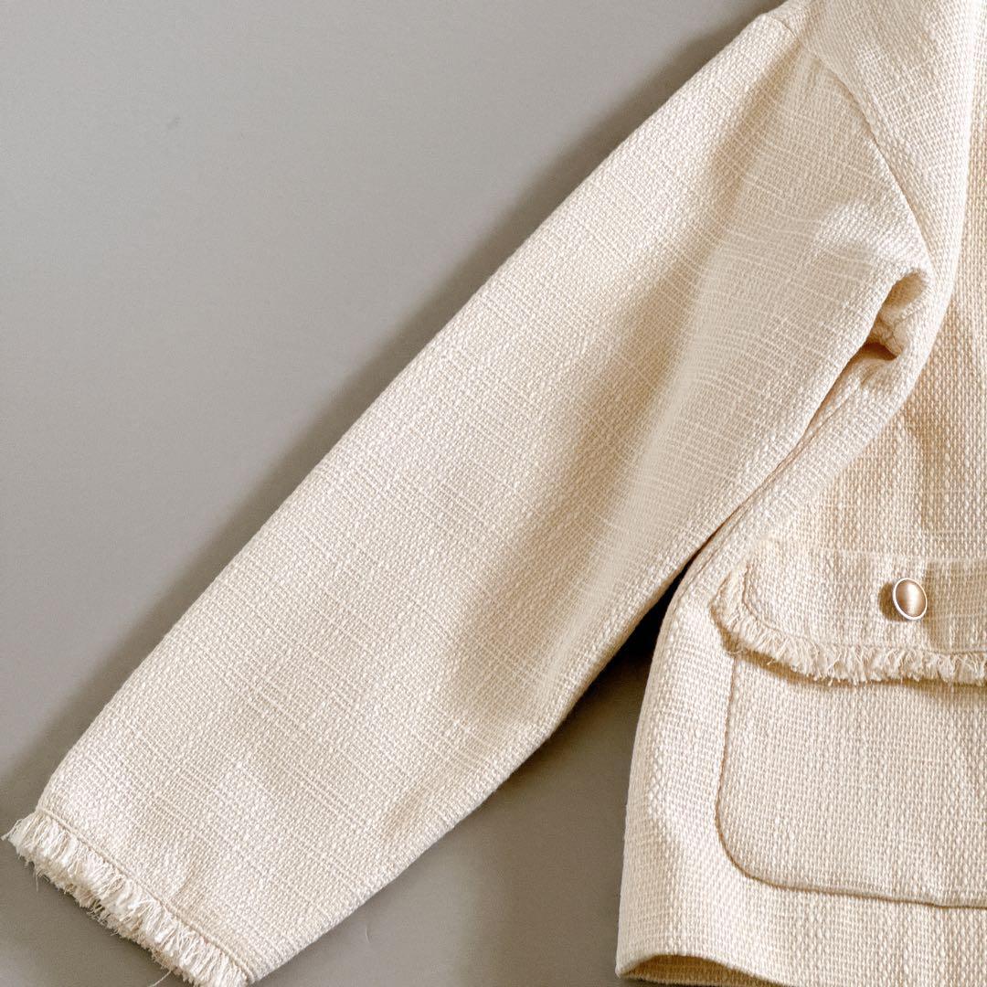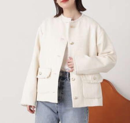 上質なツイード素材を使用した、ノーカラーデザインのジャケット。