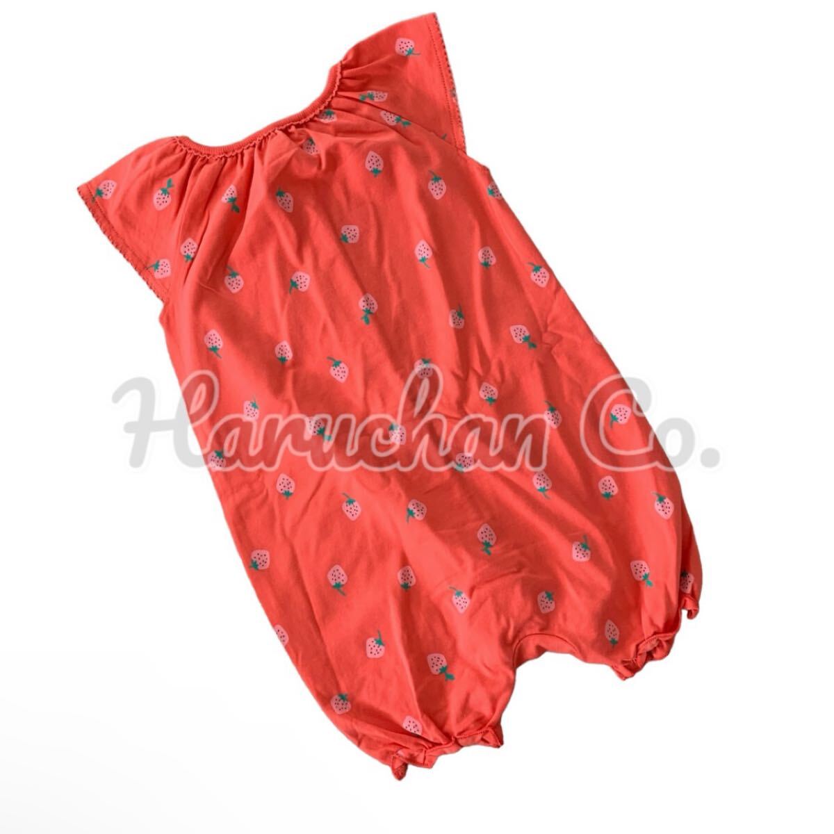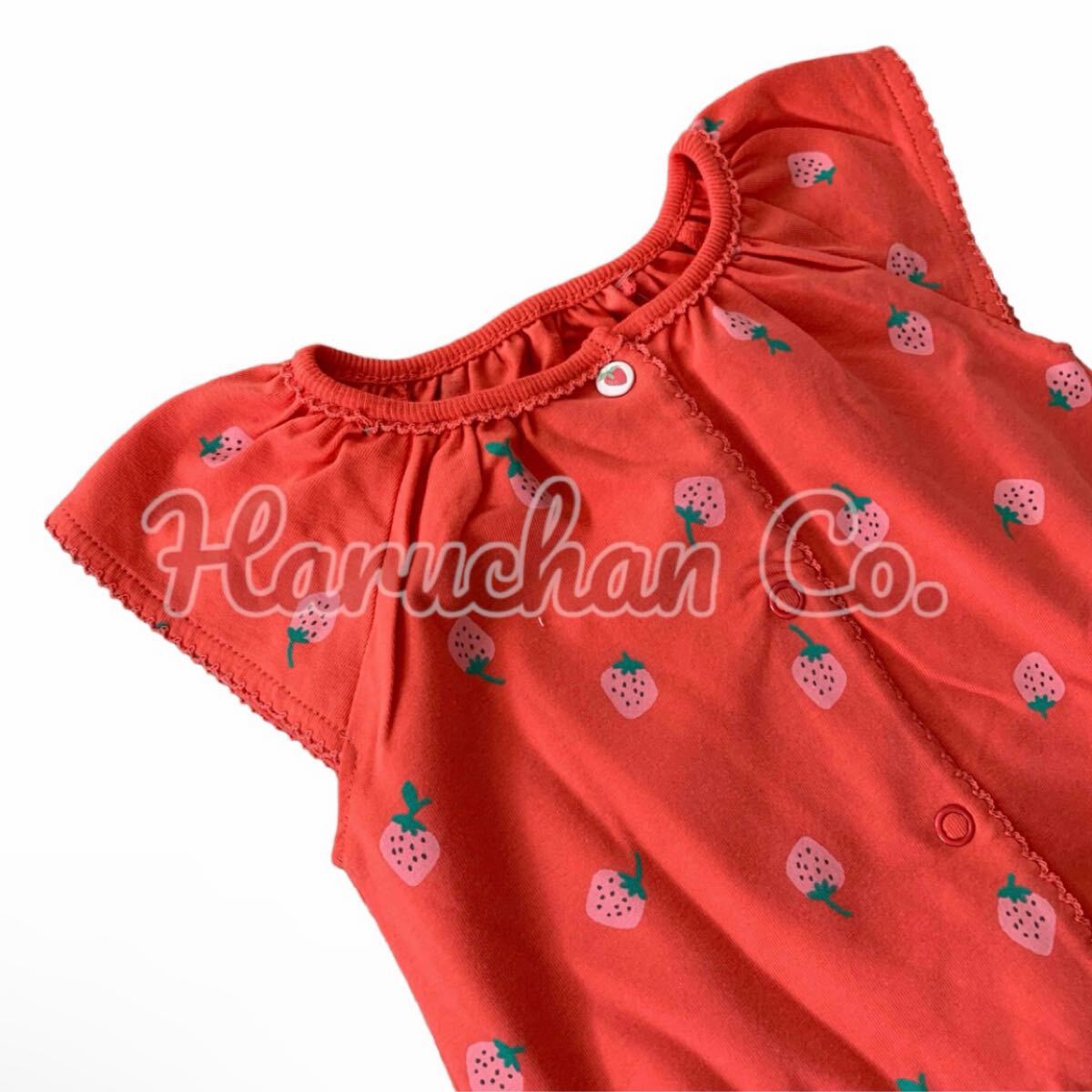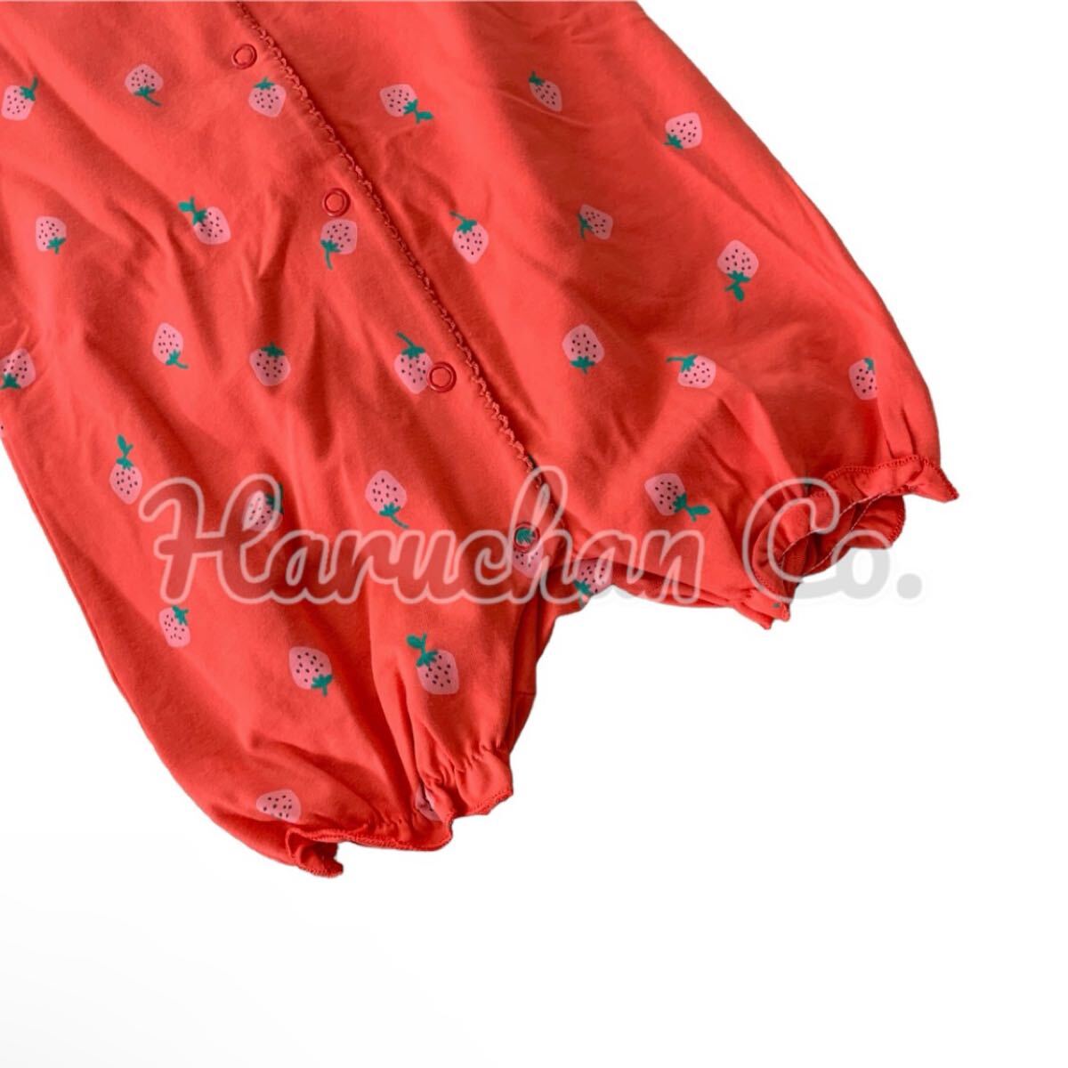 レッドにストロベリー柄のかわいい前開きロンパース