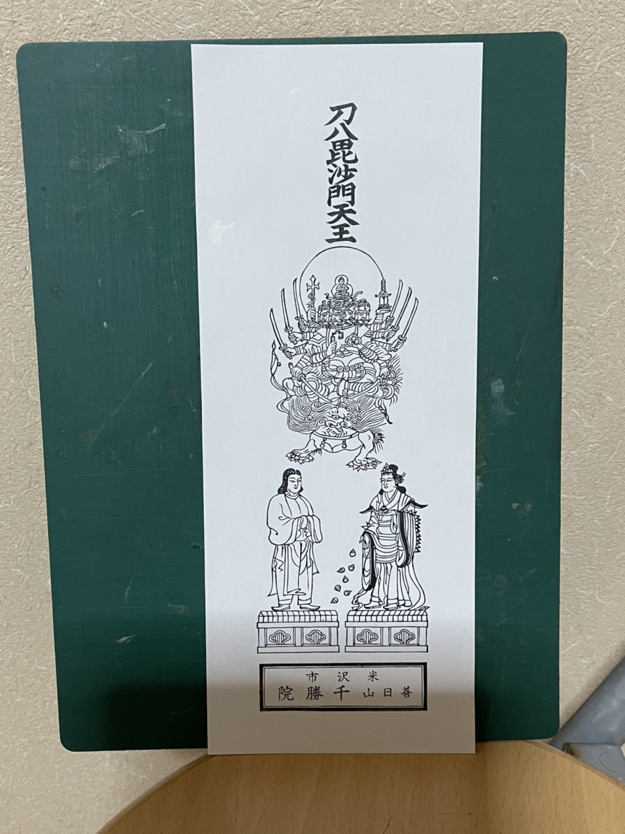 米沢にあります。千勝院の刀八毘沙門天様の御影になります。刀八毘沙門天様は、上杉謙信公が信仰し、千回戦えば千回勝利したと云われた毘沙門天様になります。