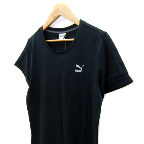 未使用品 プーマ PUMA Tシャツ カットソー ロング丈 半袖 ラウンドネック ボーダー柄 ロゴ プリント M 黒 ブラック /SY1 レディース
