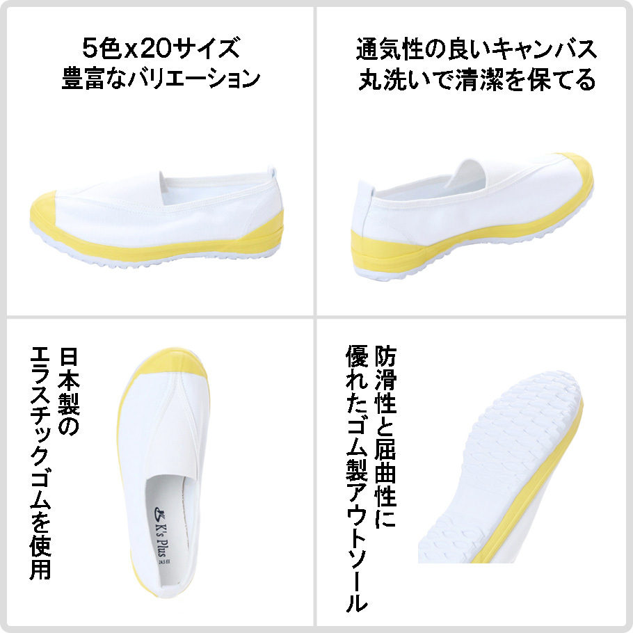 ゴム底は防滑性、屈曲性、耐摩耗性に優れており、キャンバス甲材は丈夫で肌に優しく、丸洗いができて清潔を保てるのもうれしいポイントです。