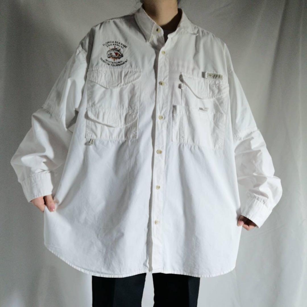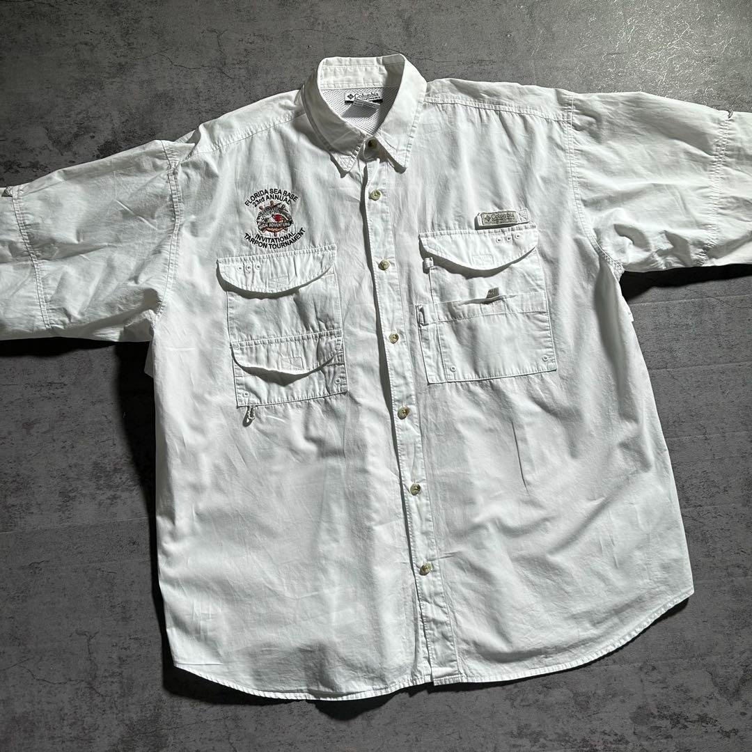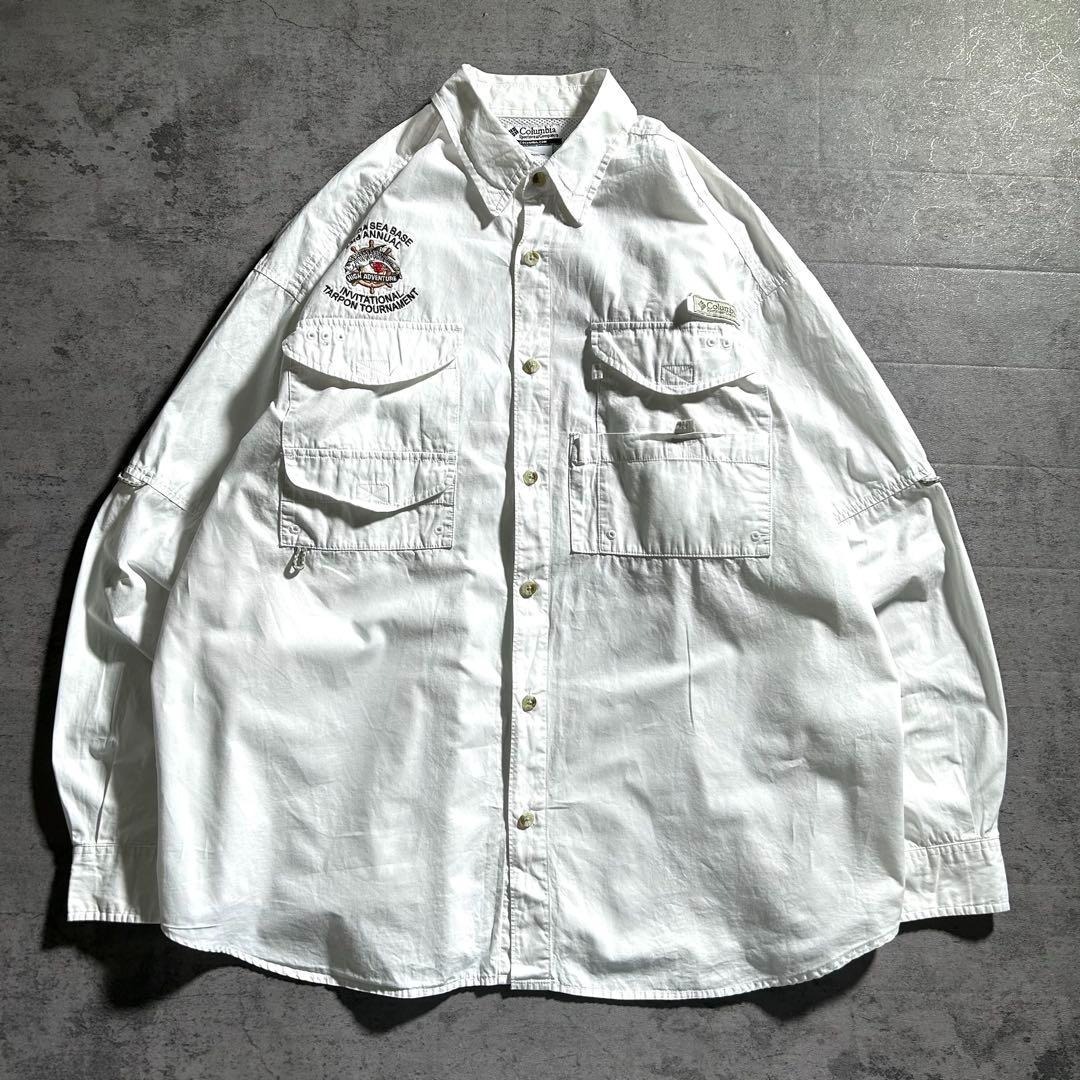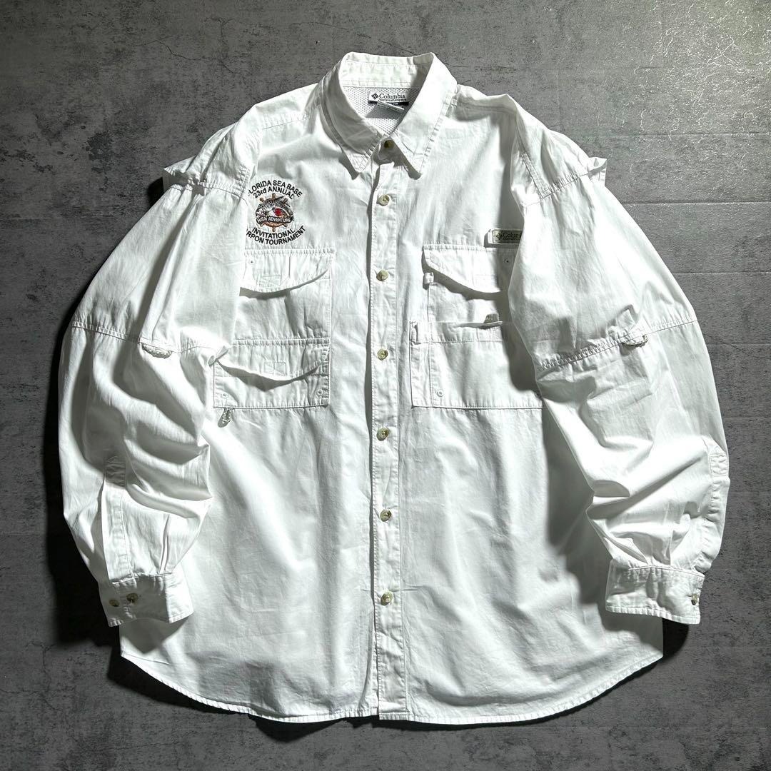 コロンビア Columbia PFG 長袖 フィッシングシャツ 魚 刺繍ロゴ ホワイト 白 メンズXL 00s 古着 / A3081