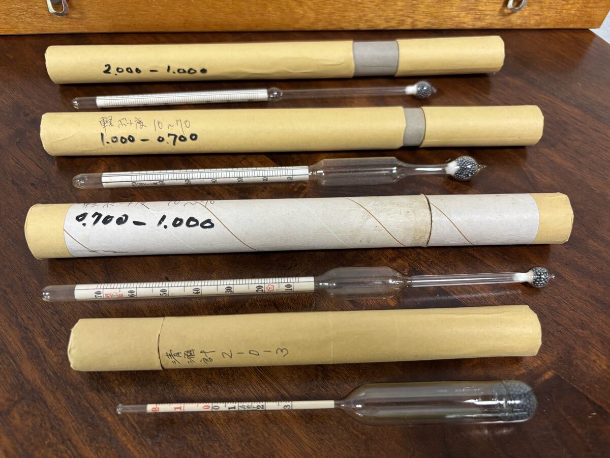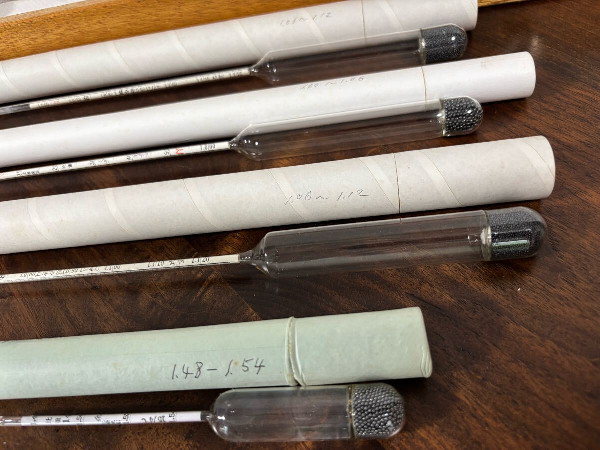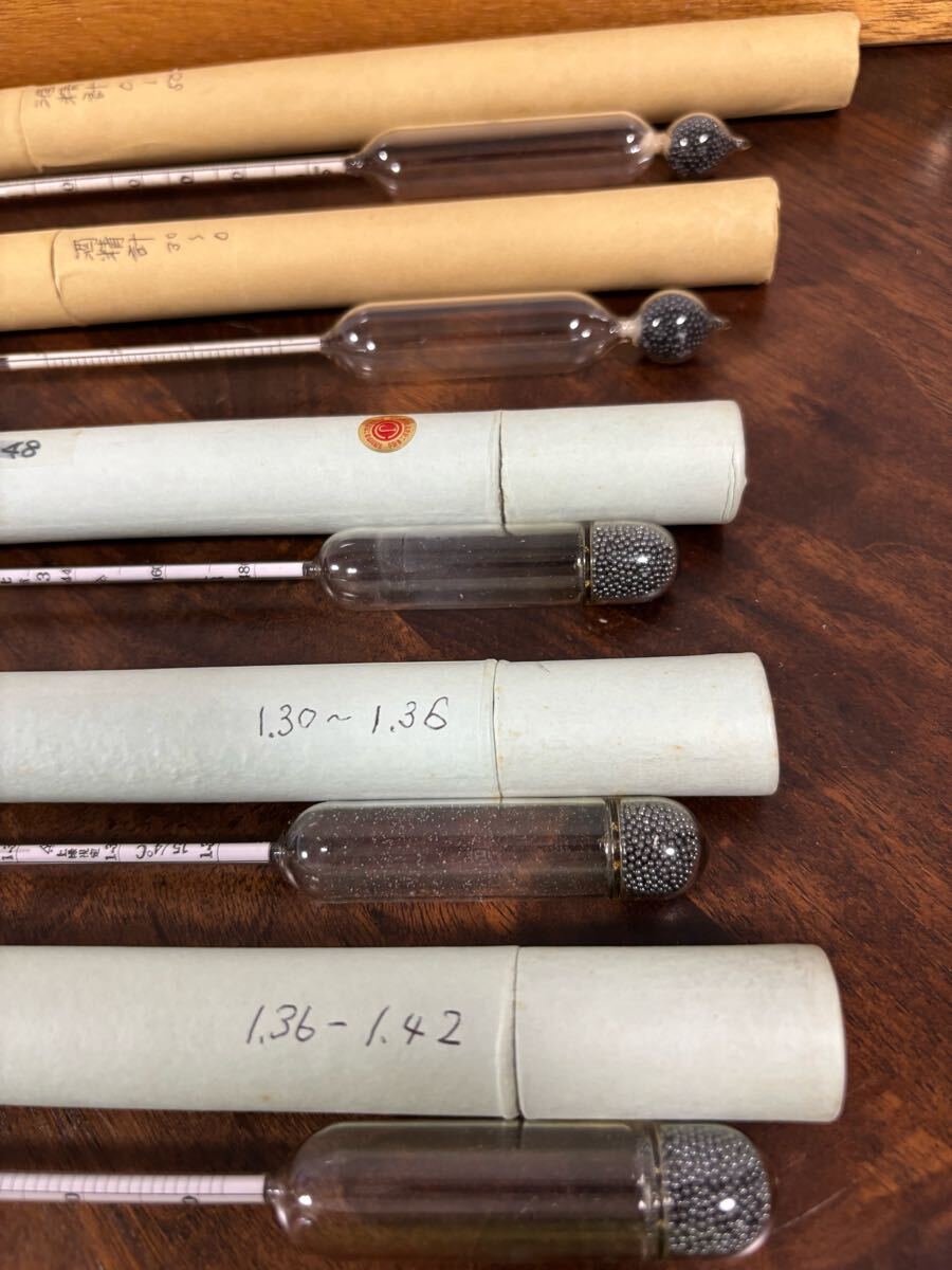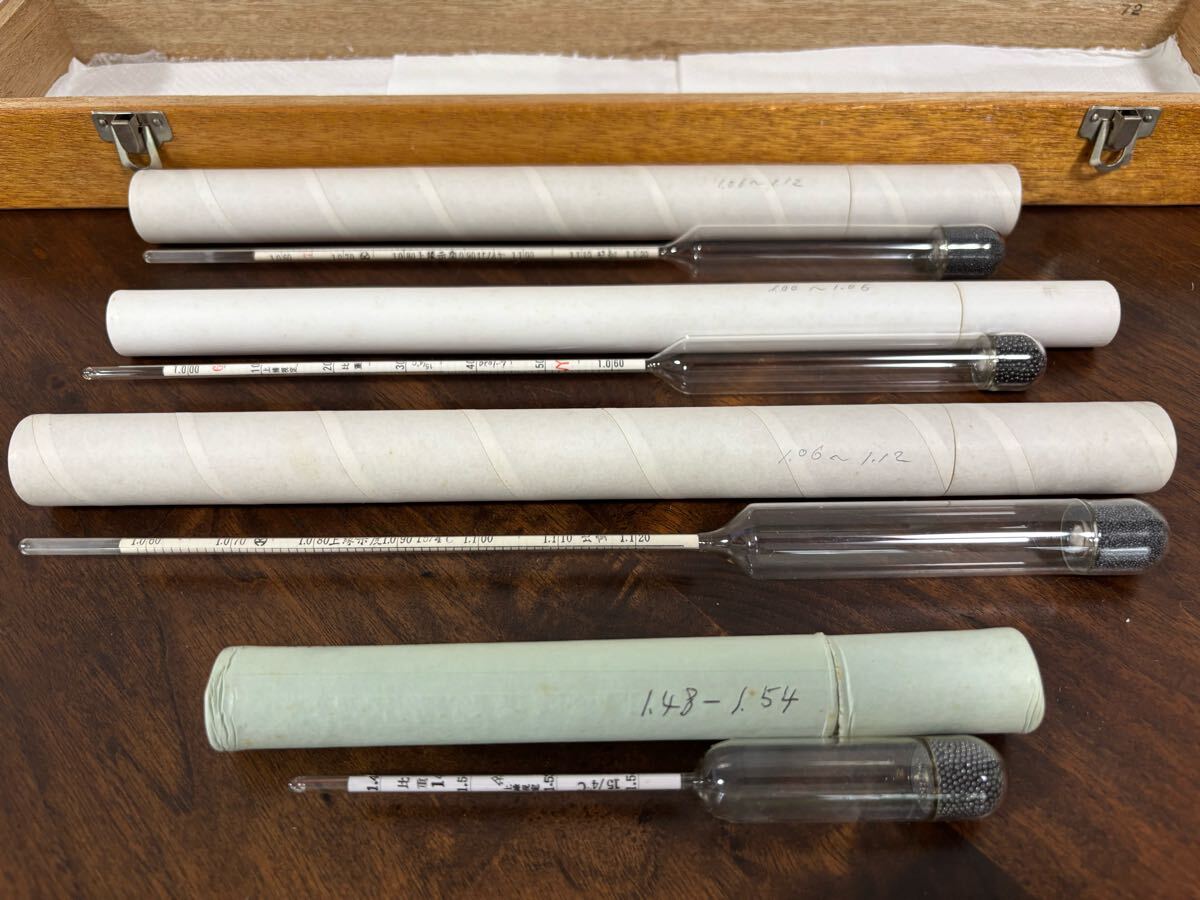 自宅の棚の奥から出て来た木箱に入ったガラスの比重計15本です。