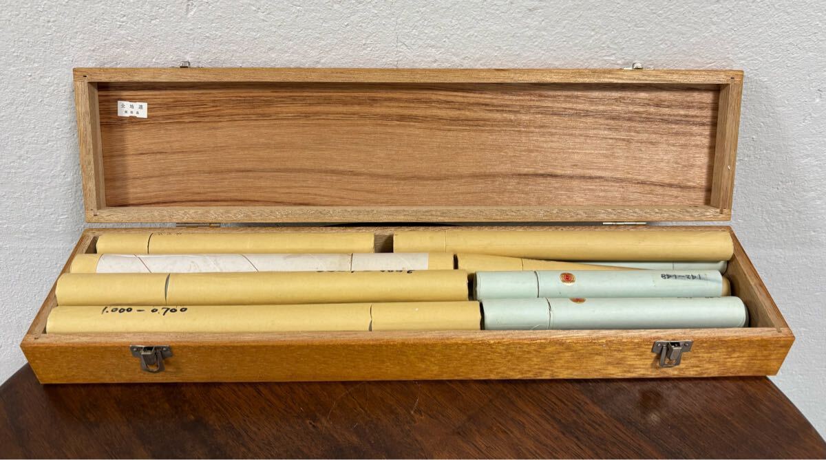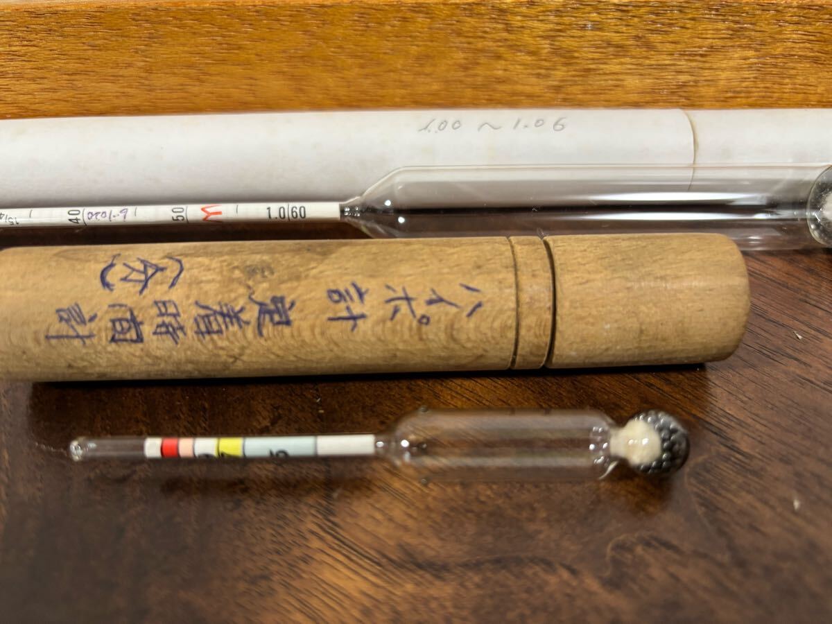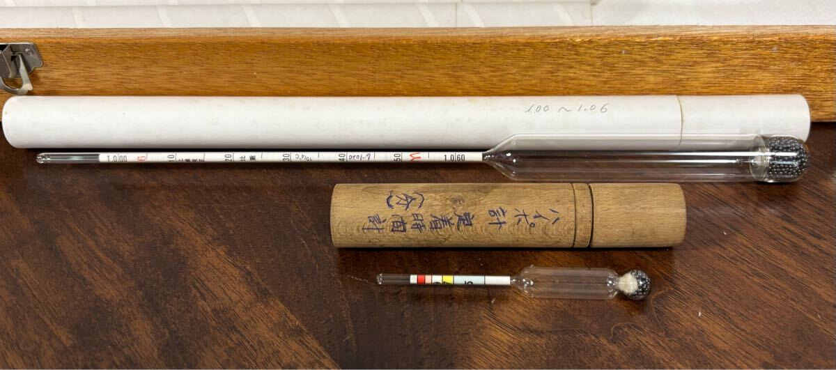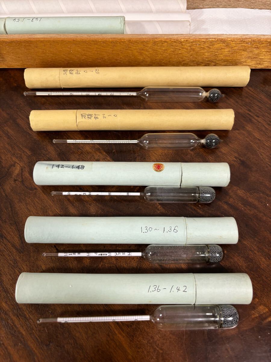 自宅の棚の奥から出て来た木箱に入ったガラスの比重計15本です。