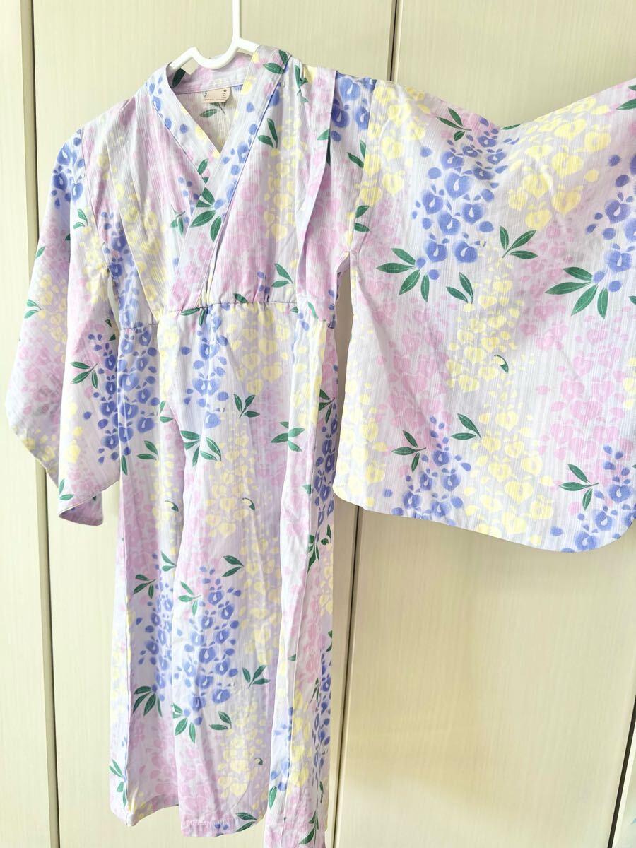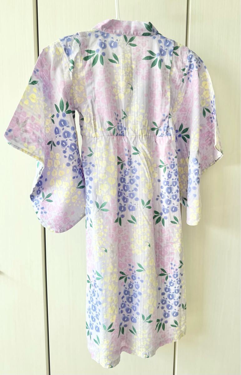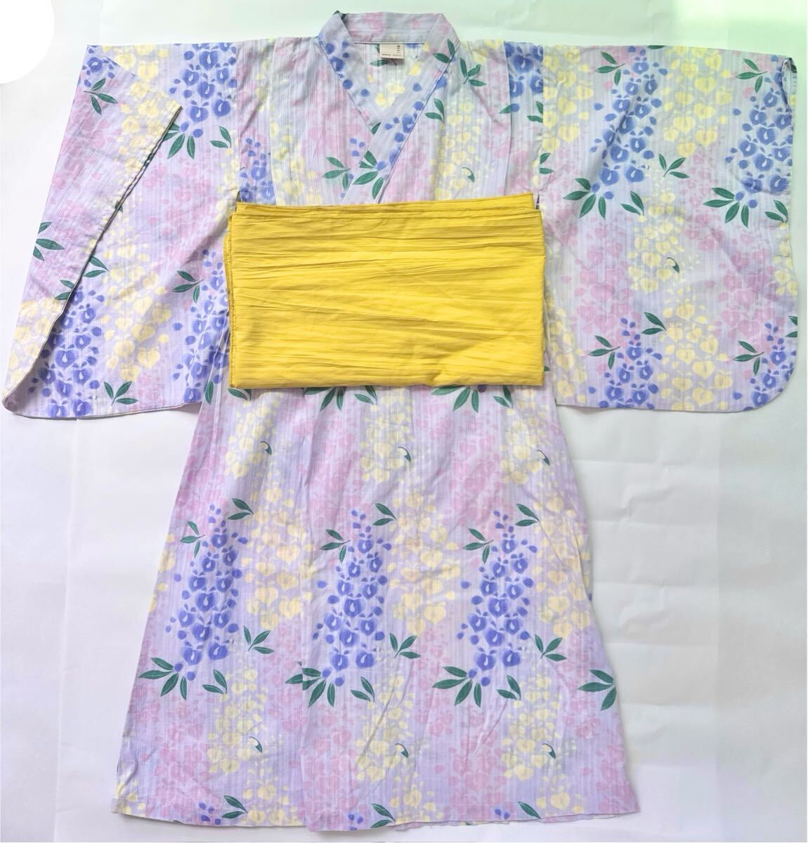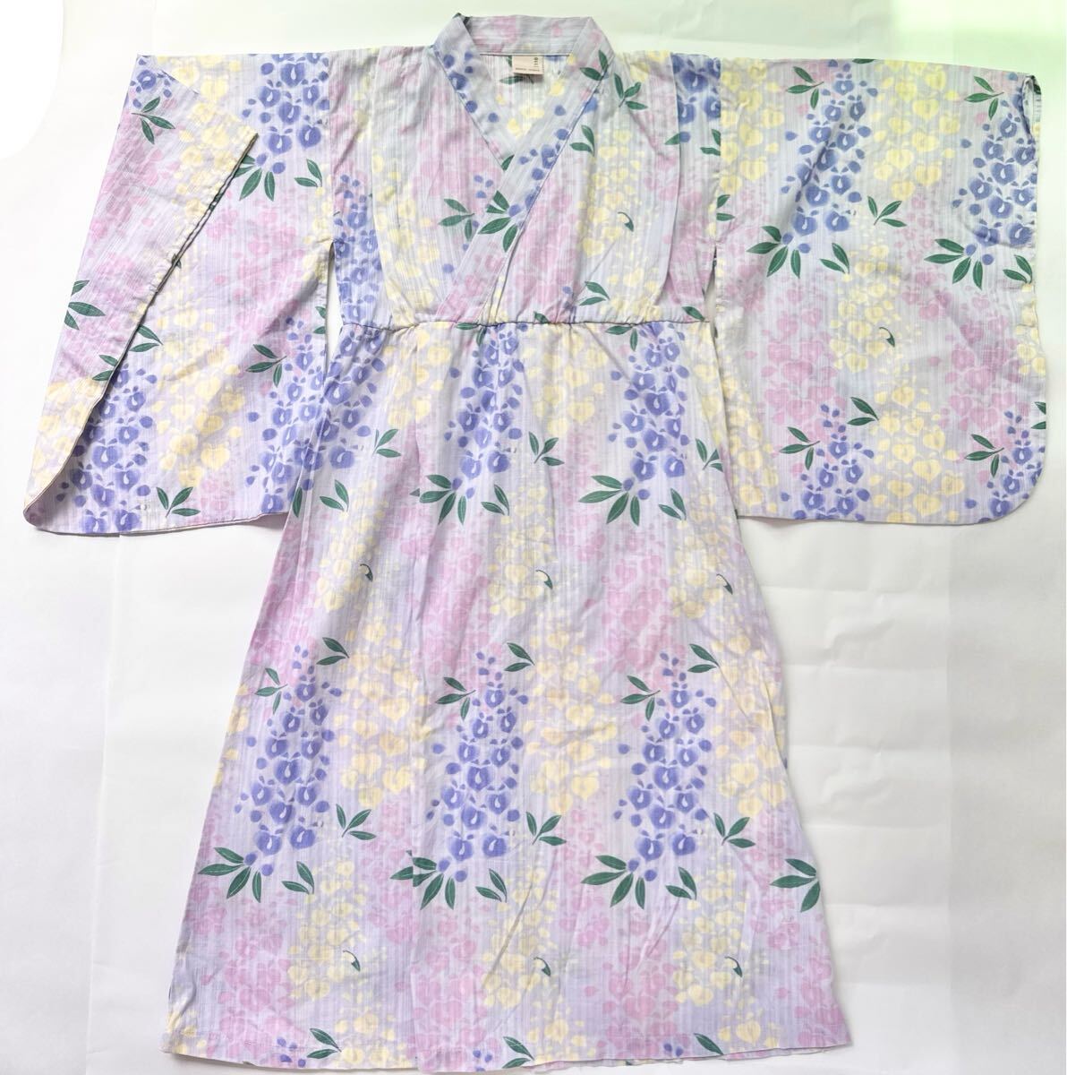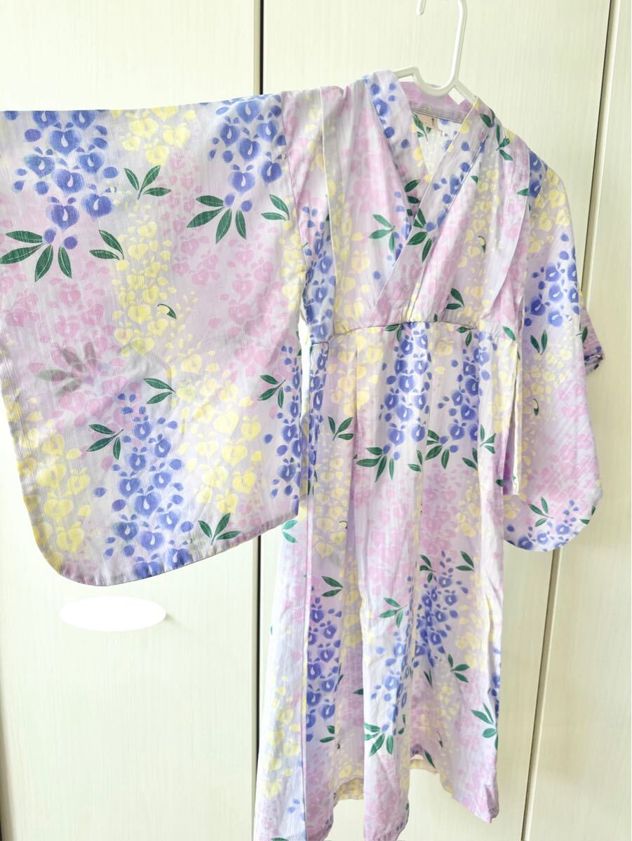 女の子らしいやさしい雰囲気を感じる、藤の花柄で仕上げた浴衣です。ふっくらと結べるクシュクシュの帯は、後ろ姿をキュートに演出♪ 縦に線の入った薄手の綿素材で着心地も涼しく快適です。内側にはお名前を記入できるタグつき。
