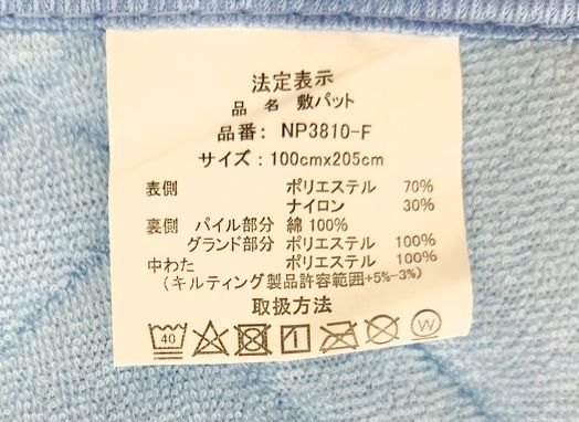 | 商品説明 | 【商品紹介】 【ひんやり接触冷感&シンカーパイル 敷きパッド 2枚組】 * リバーシブルに使えるひんやり、夏にオススメの冷たい敷パッド 表面 ● 接触冷感 熱を奪い、ひんやりとした心地よい肌さわり ● 吸汗速乾 汗を素早く吸収拡散します 裏面 ● 綿パイルを使用しています。 こちらもひんやり感触です。 * 四隅ゴム付きですので、簡単に取り外しができます。 ロングサイズの敷布団やマットレスにも最適です。 【商品品質】 * 品番:NP3810-F * サイズ:100×205cm シングル * 生地:(接触冷感面)ポリエステル70% ナイロン30% (タオル地綿) パイル 綿100% * 詰物:ポリエステル100% * 無地 グレー、ブルー 【送料】 *ゆうパック 送料無料 0円(北海道・沖縄・離島は別料金になります) |