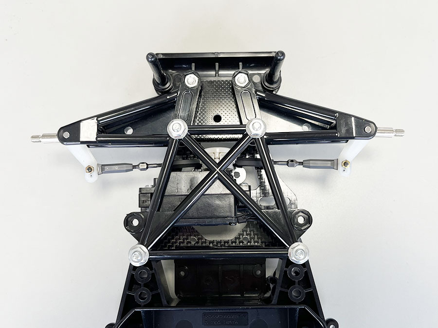 タミヤ製Cカーに当社製カーボンロワプレートを装着し、サーボの出力軸をセンターマウントした際に必須の左右等長タイプのステアリング・リンケージセットです。