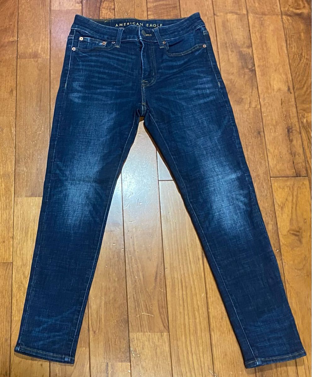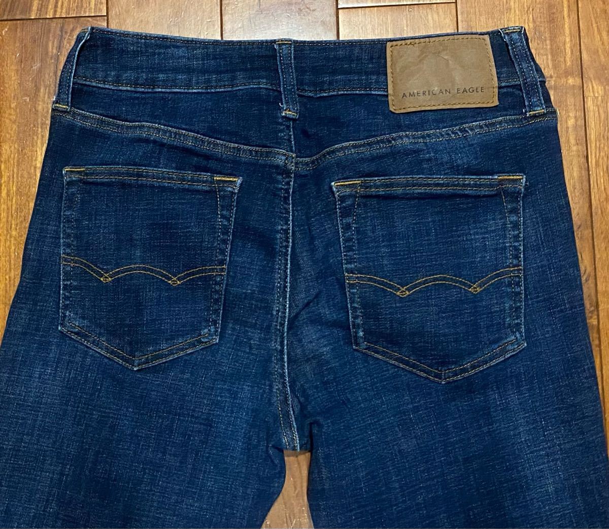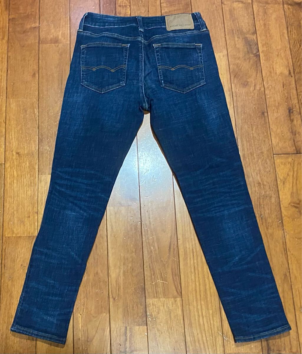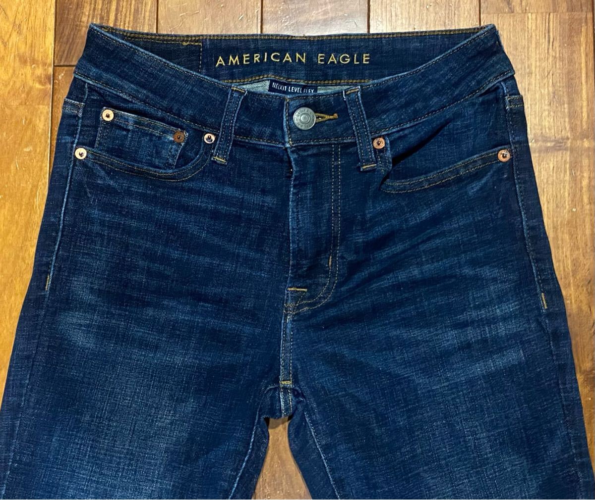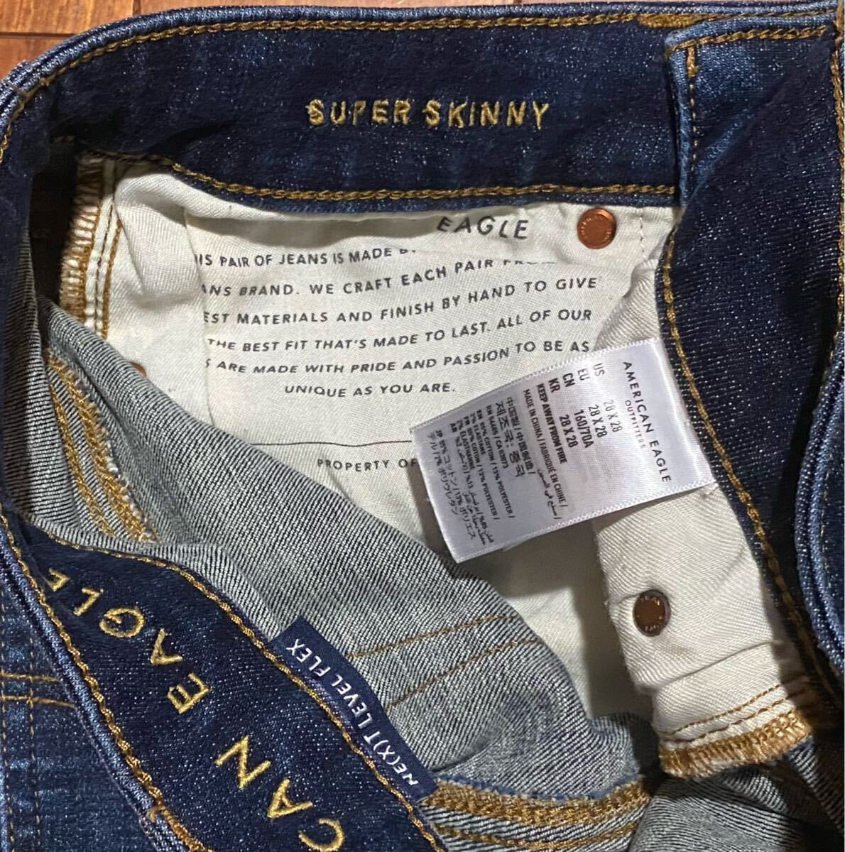 アメリカンイーグルのストレッチスキニーデニム(ジーンズ)、NE(X)T LEVEL FLEX SUPER SKINNYです。色はインディゴブルーです。USEDですが状態は良いです(10段階中8程度)。生地はストレッチ入りでコットン85%、ポリエステル13%、ポリウレタン2%です。紙パッチ、ジッパーフライ、裾はチェーンステッチです。正規品です((株)イーグルリテイリング、中国製)。サイズはW28×L28でウエストは重ねずに平置きで約71cm、ヒップ約89cm、股上約24cm、股下約71cm、股下15cmのふともも部分約44cm、裾まわり約28cm、重量約500gです。発送はゆうパケットポストになります。