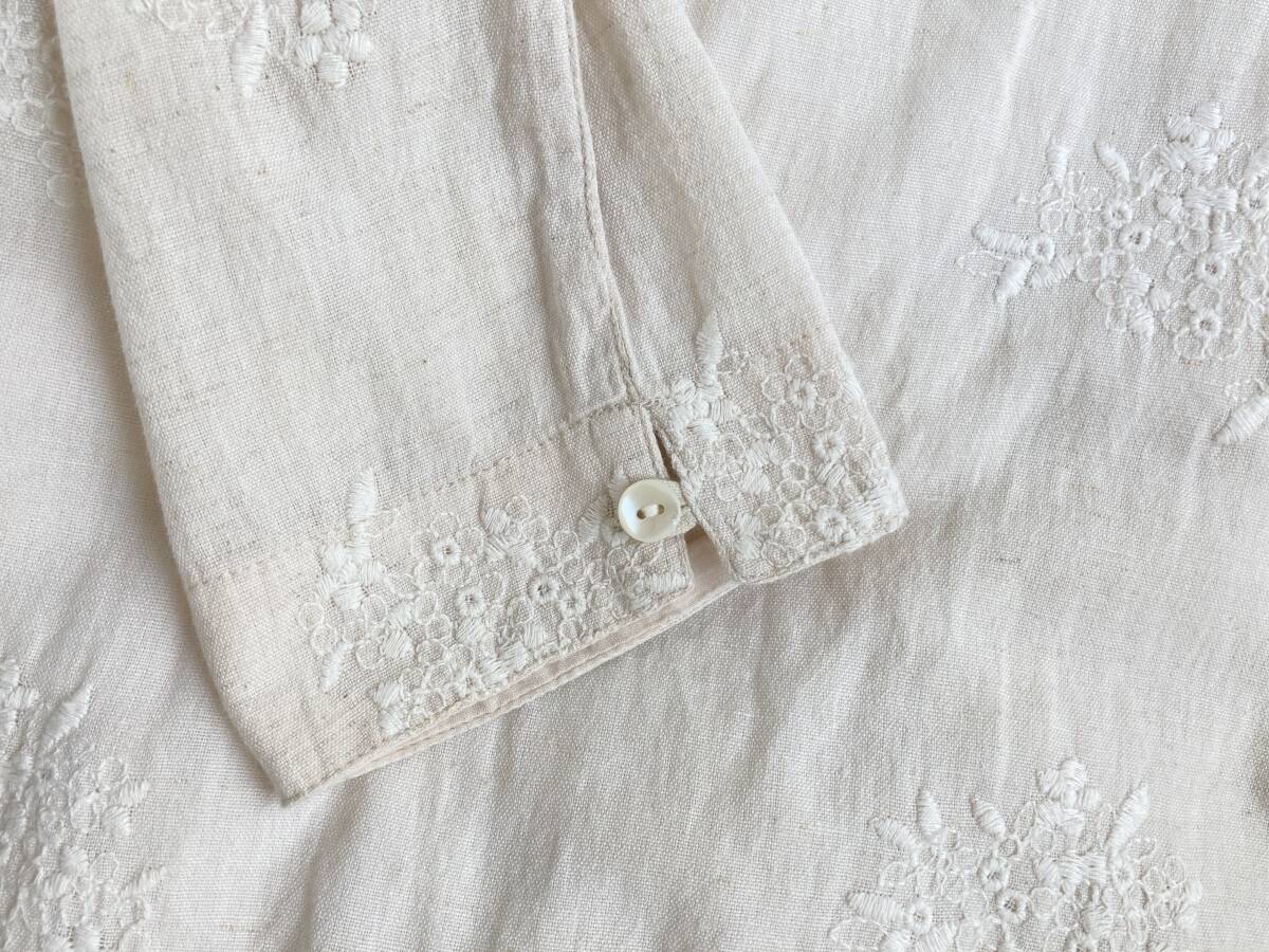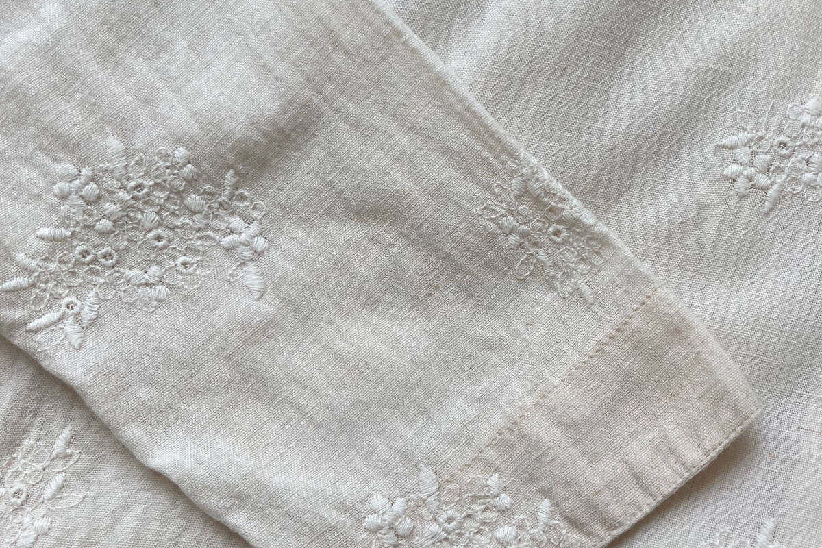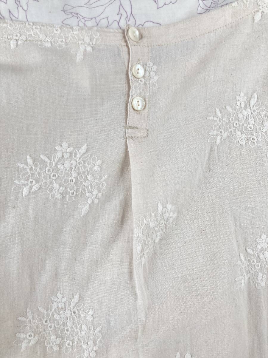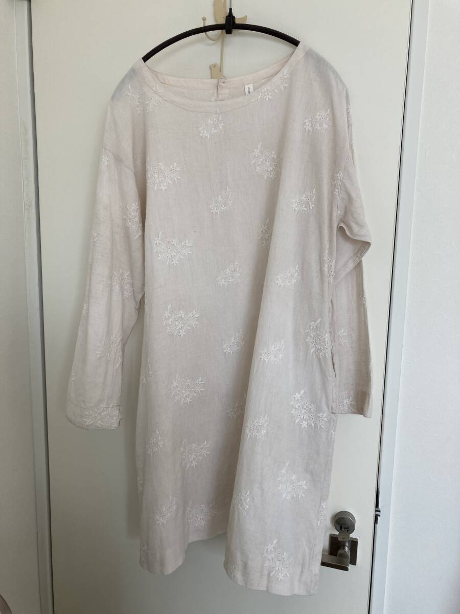 生成りのチュニック、生地に刺繍が入っています。元々ロングワンピースだったものを短くしました。目安のサイズは身幅56、着丈84、袖丈48cmでたっぷりしています。左右にポケットがあります。使用回数は少ないです。