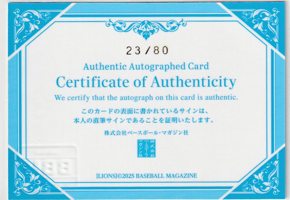 パックから出る直筆サインカードでシリアルナンバーが入っています。シリアルナンバーは23/80のジャージーナンバーです。画像にはスキャナーの埃や縦線が写っている場合がありますが現物は美品です。