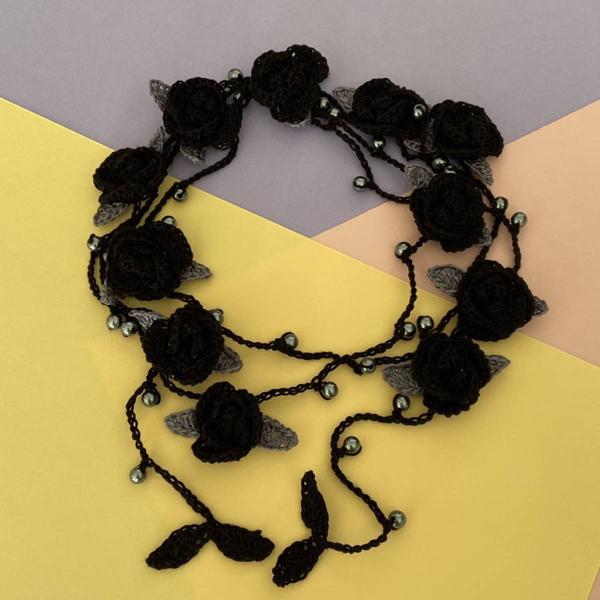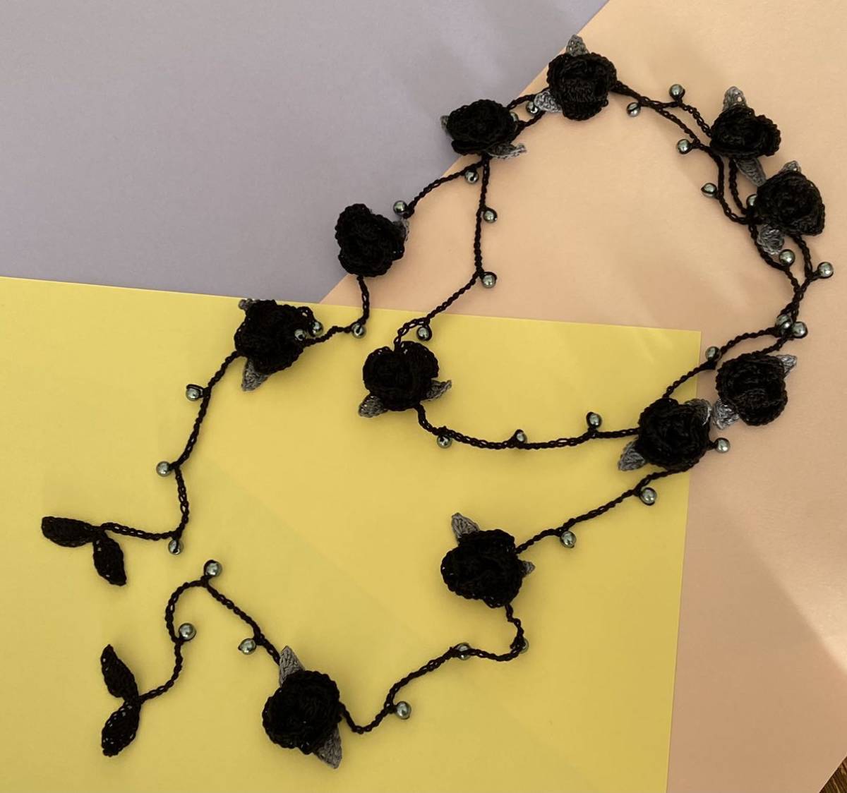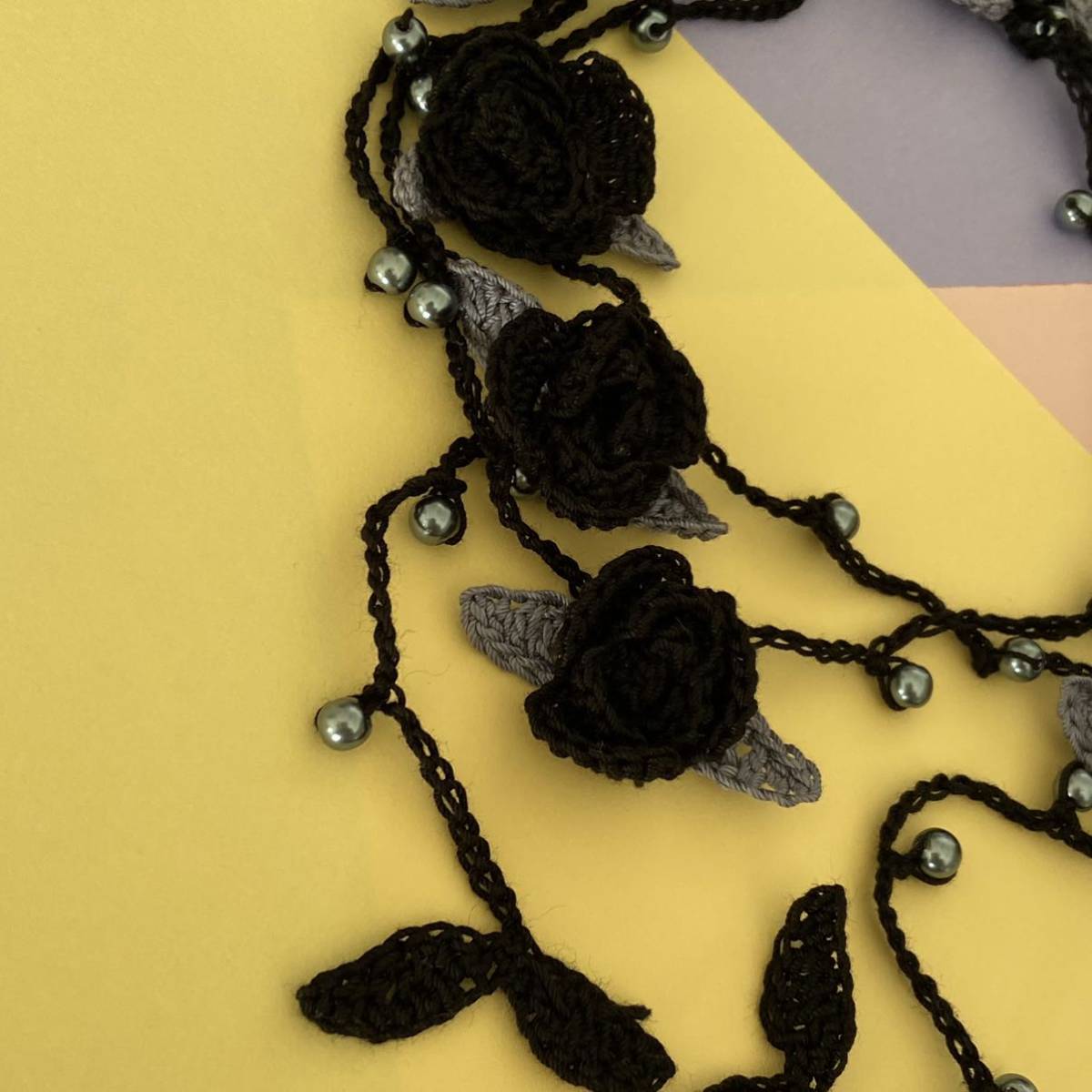 ハンドメイド、レース糸で編んだ、黒とグレーの巻バラローズのラリエットです。