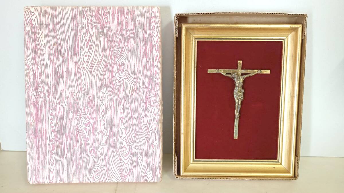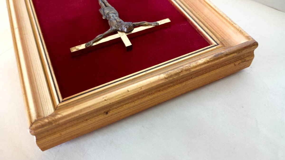 木製のフレームにブロンズ製のキリストが掛かっており、フレームの中の素材はベロア生地を使用して