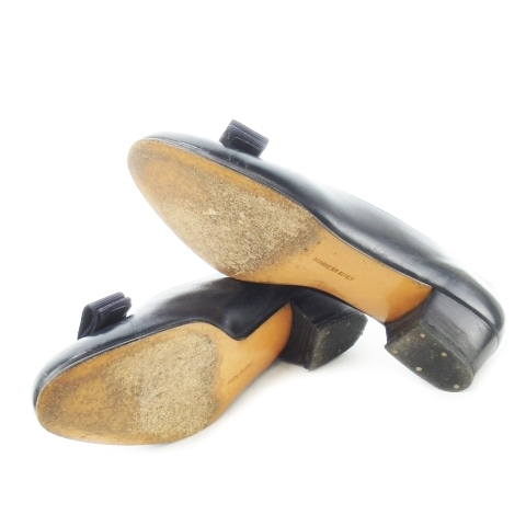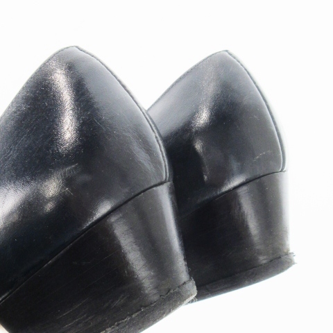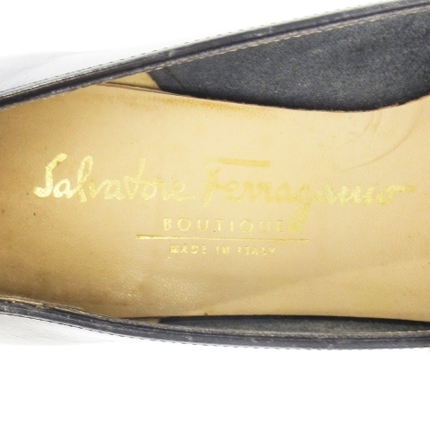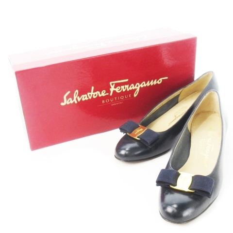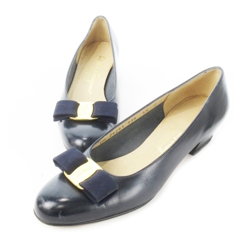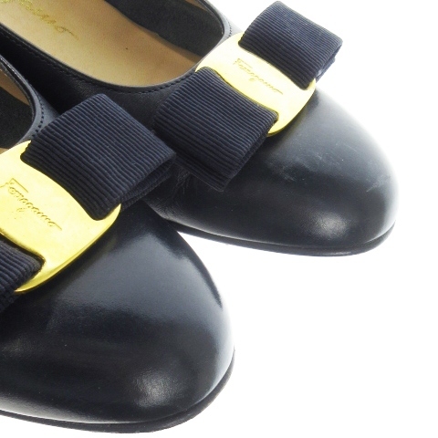 サルヴァトーレフェラガモ Salvatore Ferragamo BOUTIQUE パンプス ローヒール ラウンドトゥ ヴァラリボン レザー 革 ロゴ 5.5 紺