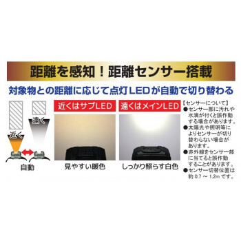 | 対象物との距離に応じて点灯LEDを自動で切り替えるセンサーを搭載。近くは見やすい暖色、遠くはしっかり照らす白色。最大約60度まで下向きに角度が変えられる。強い暴噴水から本体を守れるIPX6規格。雨天の現場でも使用可能。 |