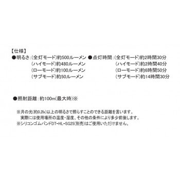| 仕様 | 電源:リチウムイオンポリマー充電池 3.7V 1500mAh(内蔵) 充電時間:約2時間 照射距離:約100m(最大時) |
