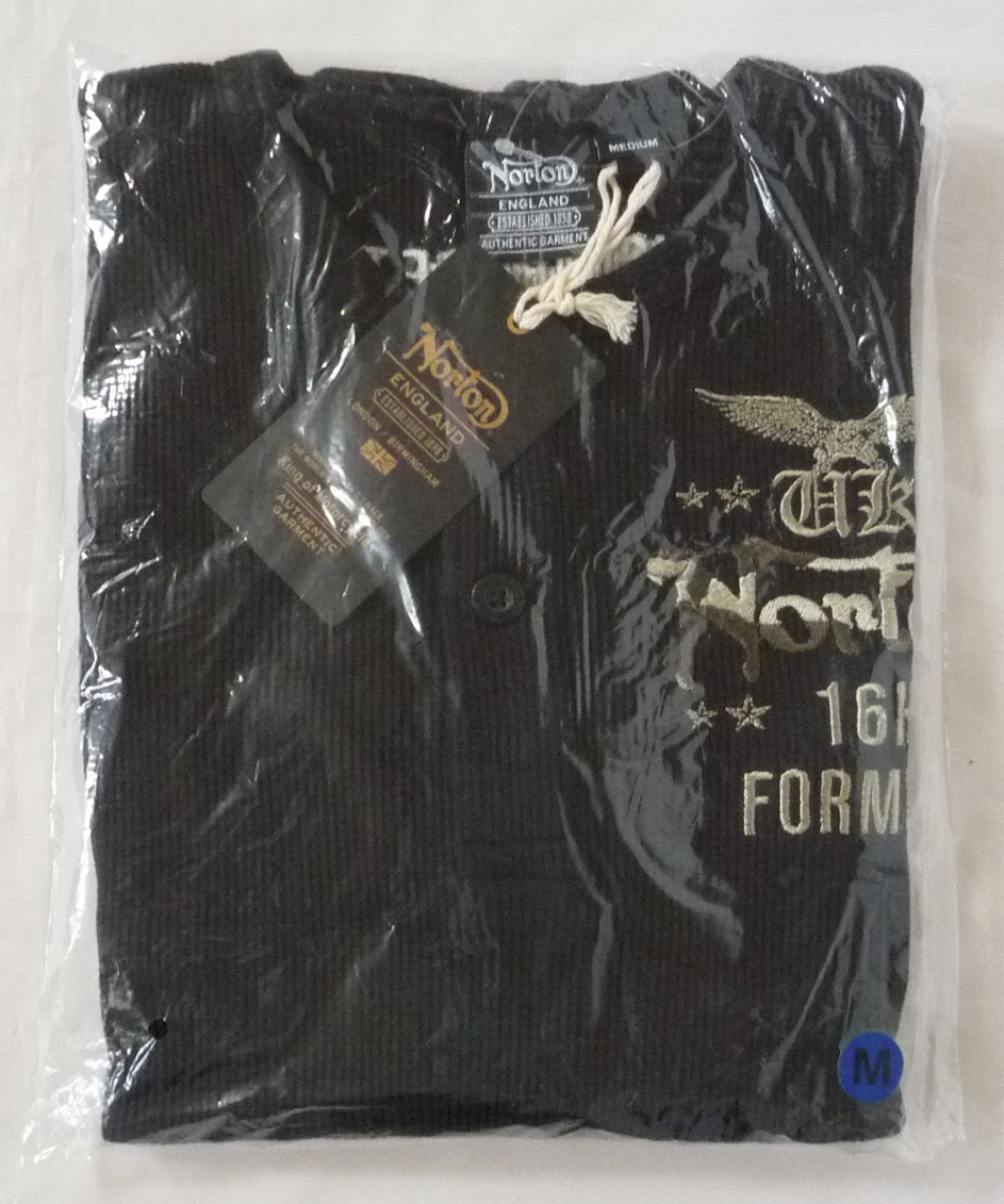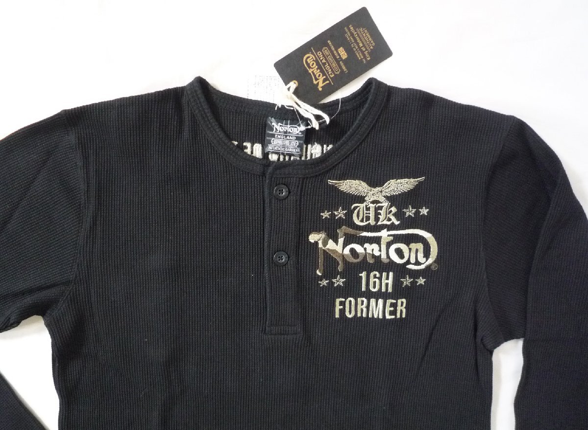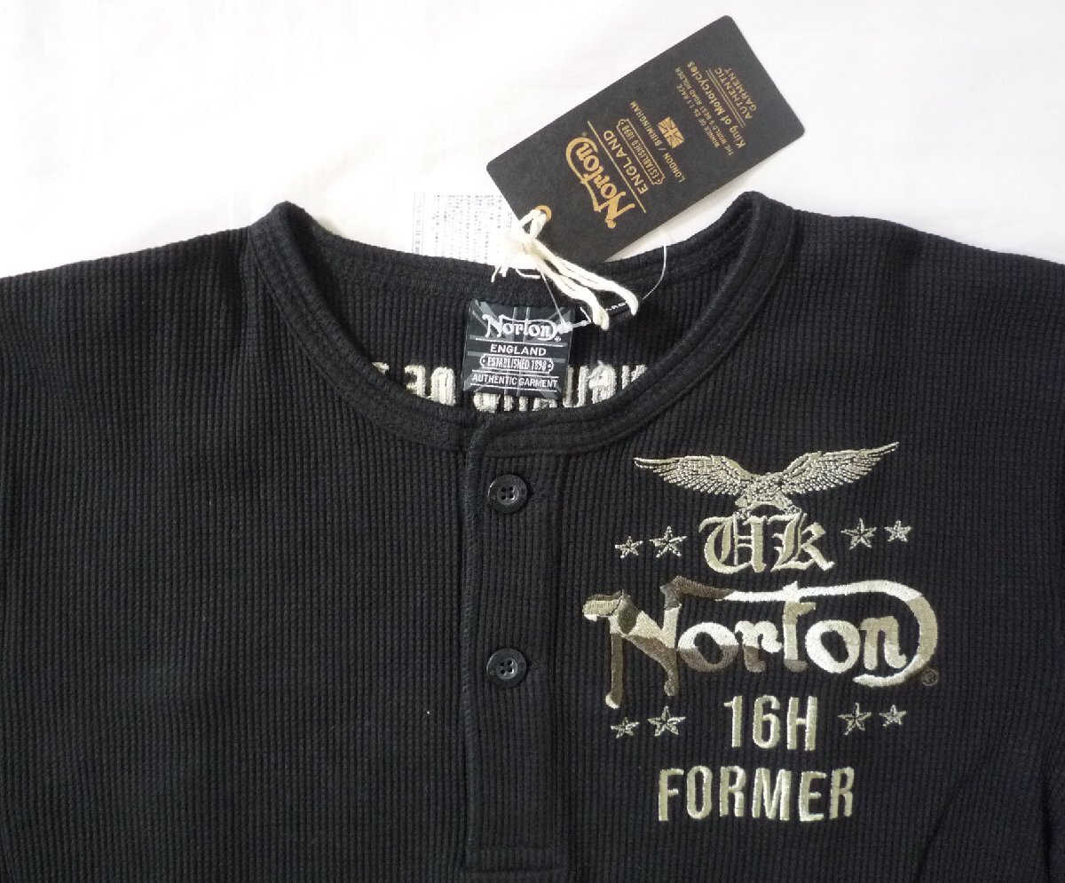 ノートン NORTON 長袖Tシャツ ヘンリーネック ワッフル編み 2つボタン 刺繍 XLサイズ ブラック 黒