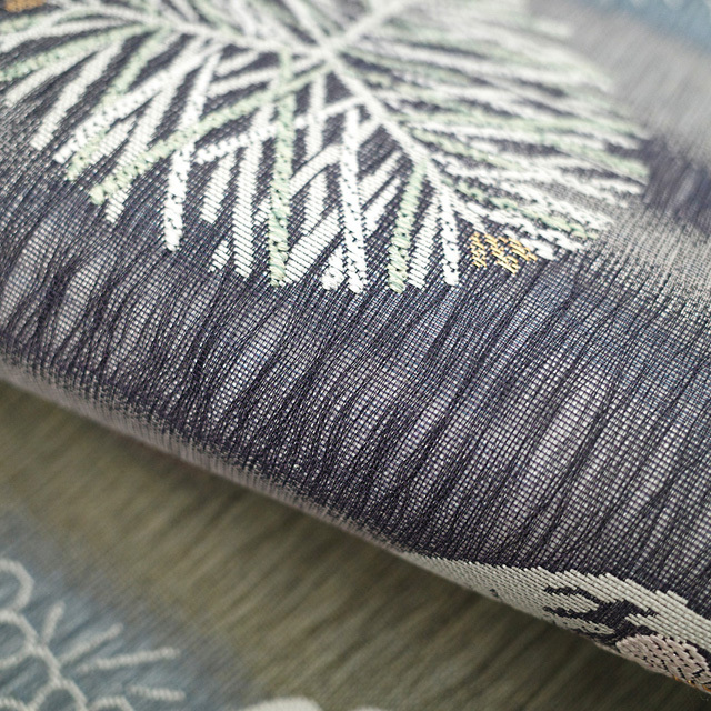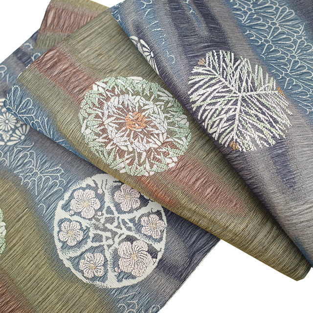 ブルーグレーやライトグレー・紺色 など落ち着いた色地に松竹梅や菊の花丸文が織り出されています。