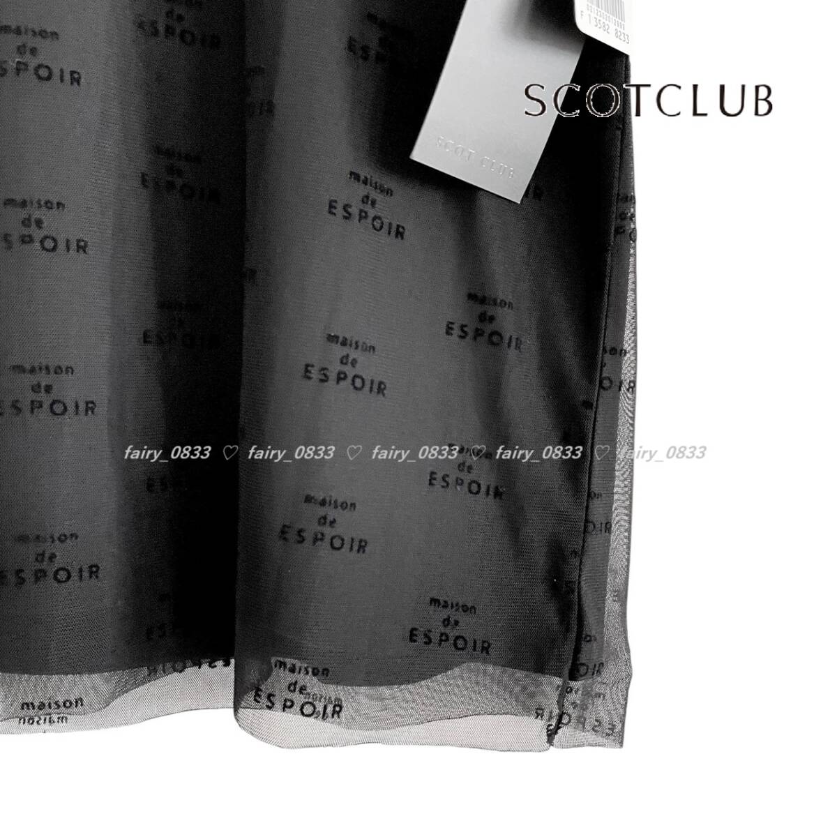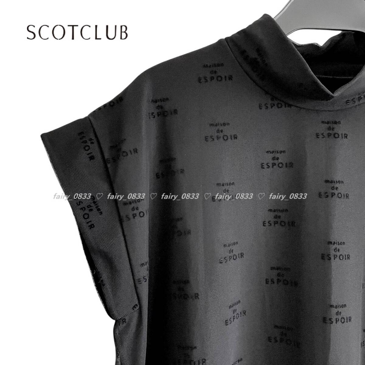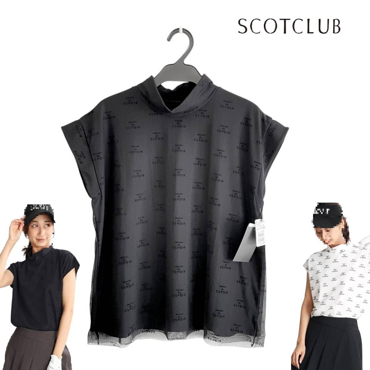 新品タグ付き、SCOT CLUBスコットクラブからチュール合わせトップスの紹介です。◆お色はブラック◆キャッチーなロゴパターンが魅力のシアーなチュールをドライタッチのカットソーに重ねたモックネックトップス♪ゴルフコーデからデイリーコーデまで活用大のトップスを是非~♪定価13.000円のお品です。※モデル画像同型同色&色違い。