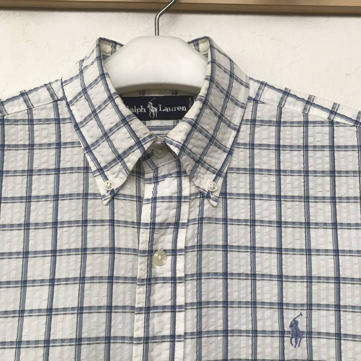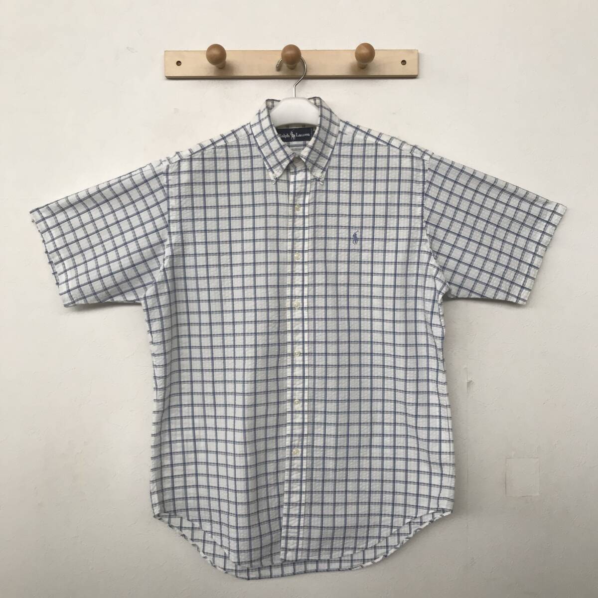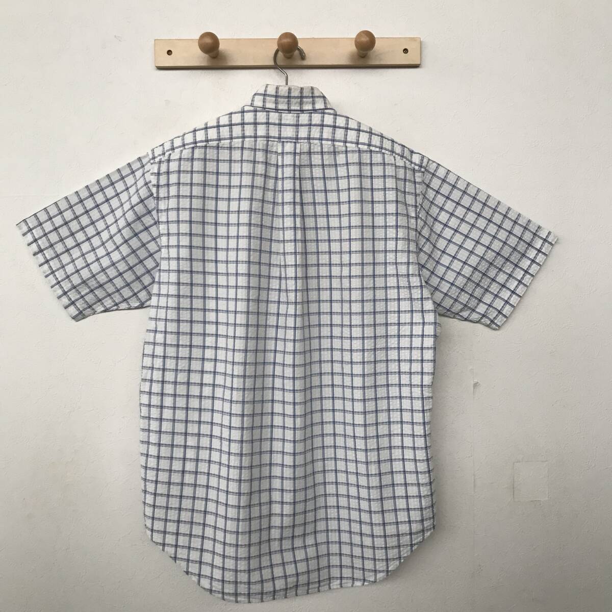 Ralph Lauren ラルフローレン メンズ チェック柄 シアサッカー半袖B.D.シャツ 良品 size M/XL BEE2405