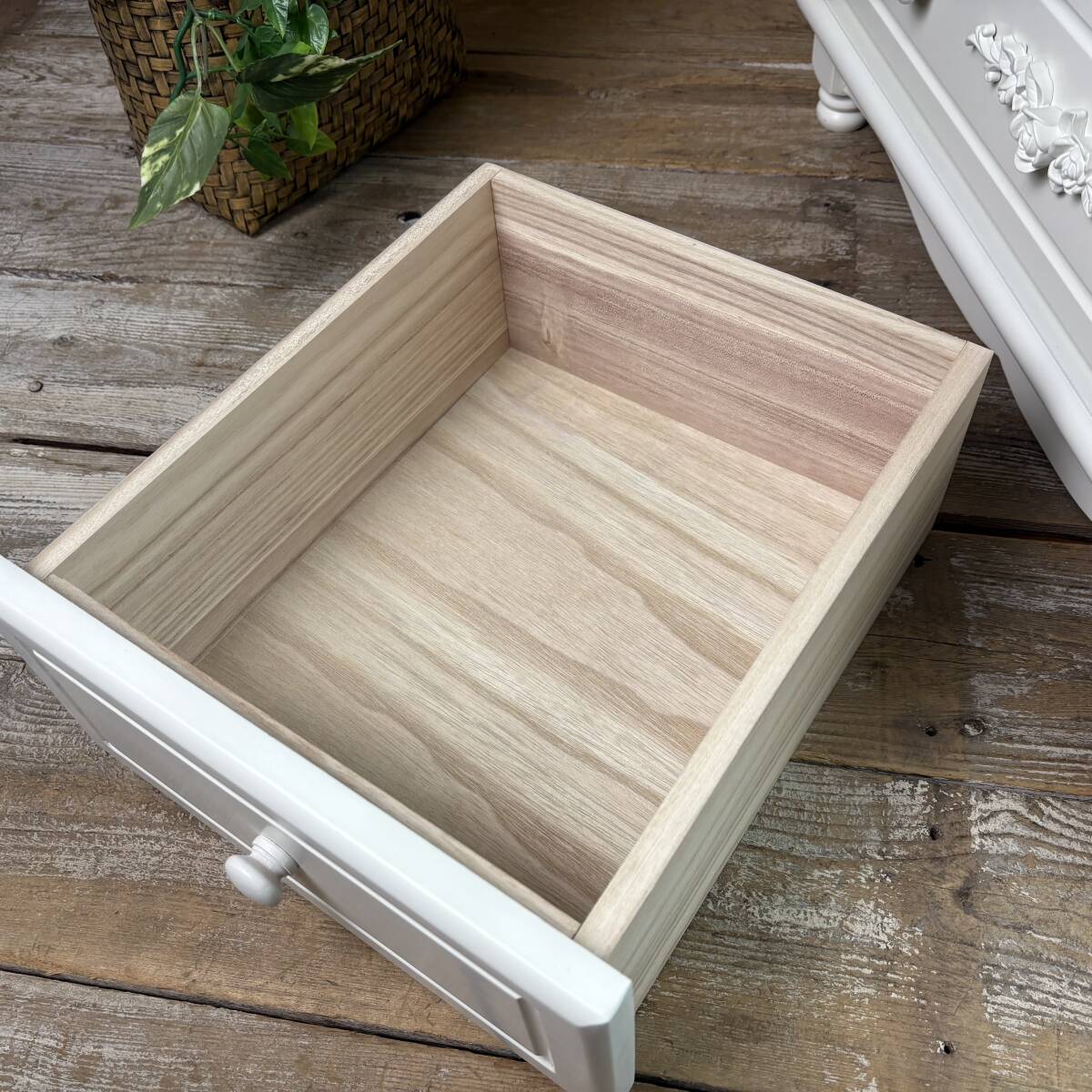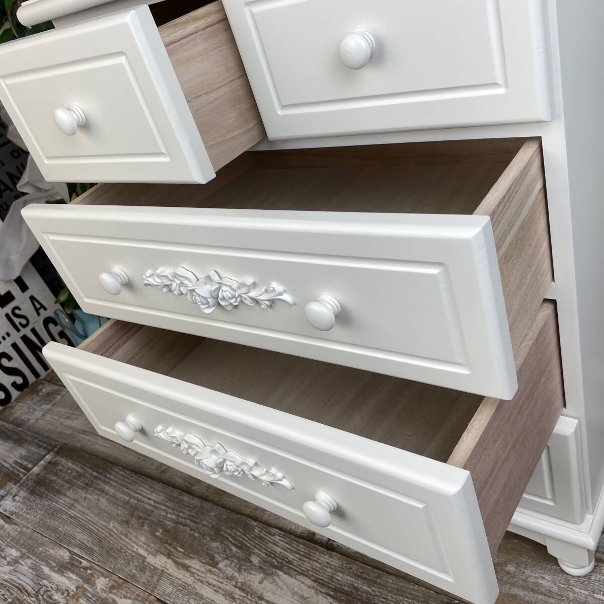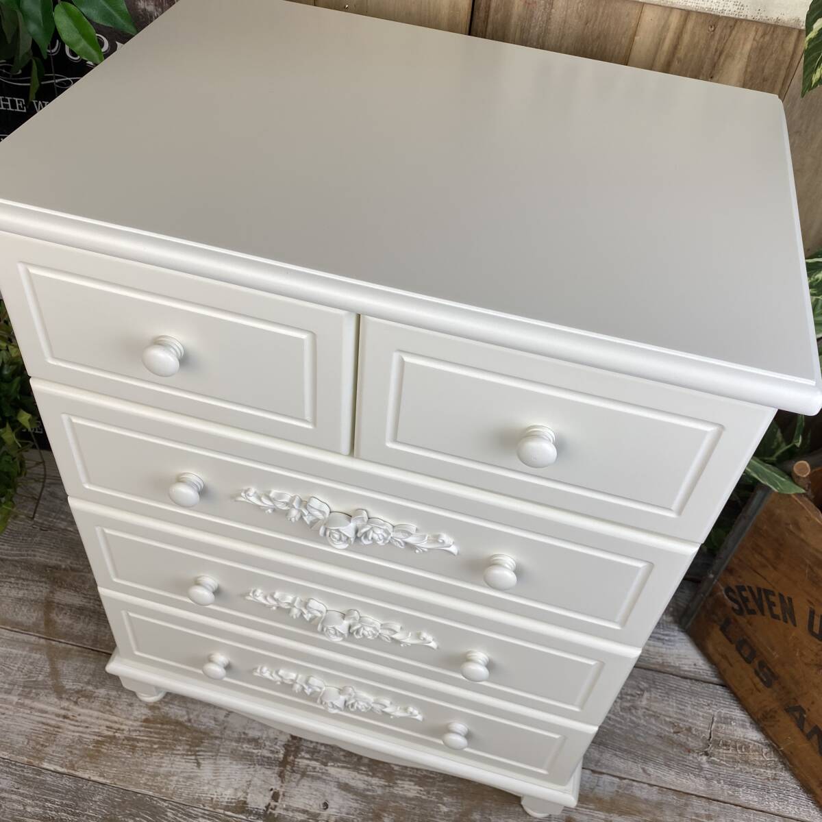 ◆◇商品詳細◇◆ フレンチ四段五つ引きチェスト フレンチアンティークデザインのカントリー家具です!材質は木製でわりと、重厚感がある豪華なキャビネットチェストです。引き出し、引き戸が収納力抜群で、洋服ダンス、キッチン収納、インテリア飾り台、ダイニング収納と用途は様々!温かみのあるホワイトがフローリングの洋室などによく合いますよ♪姫系バラ柄デザインもレトロで素敵なデザインですね。今人気の足高チェストでお部屋に置くだけで室内の雰囲気アップにも役立ちます!存在感があるのにシンプルでシックな大人インテリアに最適です!また、カフェインテリア、雑貨屋のディスプレイ、ショップの飾りつけにも役立ちそうな家具ですね。この機会に是非どうぞ。 【商品状態説明】 美品。 完成品になります。 こちらの商品は、現品画像ではありません。未開封の在庫の中から丁寧に検品後、発送いたします。 【サイズ】 横幅:50㎝ 奥行:35㎝ 高さ:65㎝ 引き出し内寸小約:19cm×28cm×11cm 引き出し内寸大約:42cm×28cm×11cm 【素材】 ウッド(MDF) ウレタン塗装 【カラー】 アンティークホワイト 【完品参考価格】 ¥24.000 | ◆◇発送方法◇◆ ●送料は基本無料ですが、沖縄・離島などにお住まいの方はご負担ください。 (沖縄・離島の方はメールにてご連絡いただければ、送料をお知らせいたします。) ●ヤマト運輸・佐川急便・福山通運大型便のいずれかにて配送いたします。 (運送会社の指定はできません。ご了承ください。) ●日時・時間指定のある方や、お問い合わせ(追跡)番号をご希望の方は取引連絡の際にお知らせください。 | |
