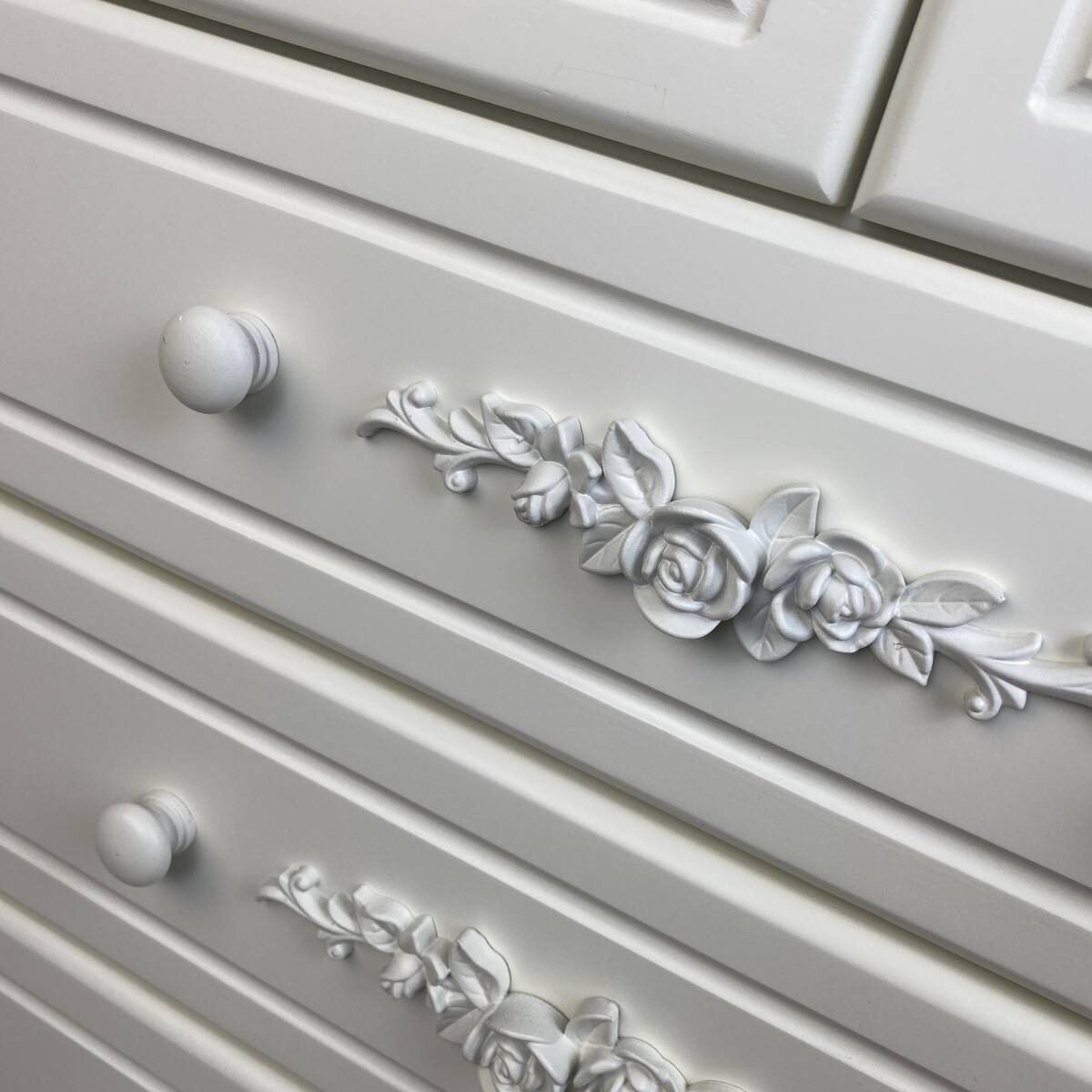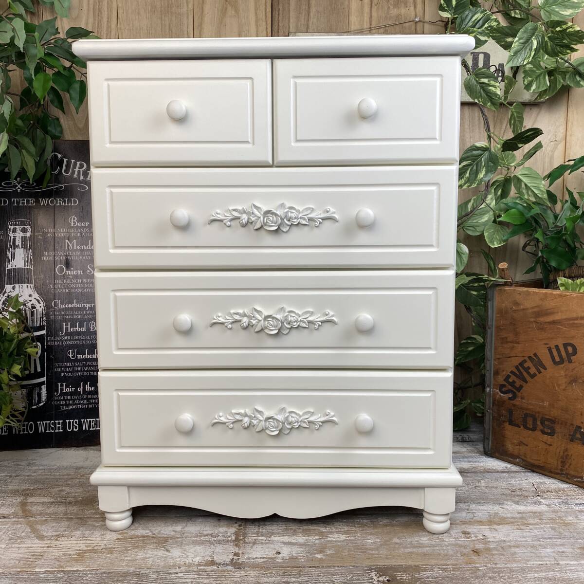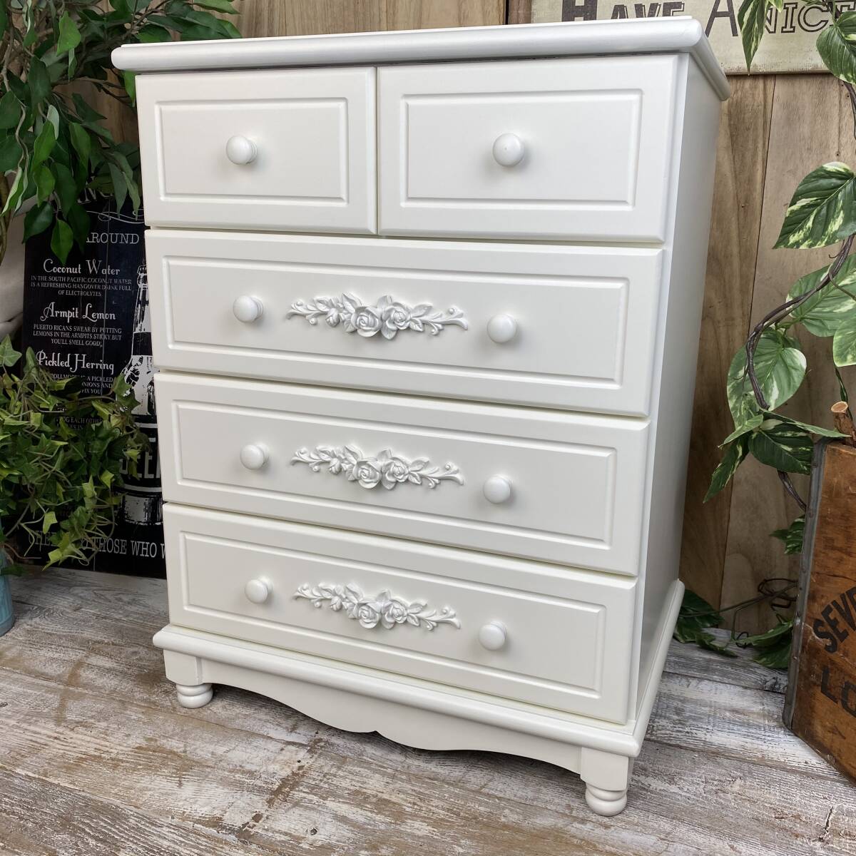 ◆◇商品詳細◇◆ フレンチ四段五つ引きチェスト フレンチアンティークデザインのカントリー家具です!材質は木製でわりと、重厚感がある豪華なキャビネットチェストです。引き出し、引き戸が収納力抜群で、洋服ダンス、キッチン収納、インテリア飾り台、ダイニング収納と用途は様々!温かみのあるホワイトがフローリングの洋室などによく合いますよ♪姫系バラ柄デザインもレトロで素敵なデザインですね。今人気の足高チェストでお部屋に置くだけで室内の雰囲気アップにも役立ちます!存在感があるのにシンプルでシックな大人インテリアに最適です!また、カフェインテリア、雑貨屋のディスプレイ、ショップの飾りつけにも役立ちそうな家具ですね。この機会に是非どうぞ。 【商品状態説明】 美品。 完成品になります。 こちらの商品は、現品画像ではありません。未開封の在庫の中から丁寧に検品後、発送いたします。 【サイズ】 横幅:50㎝ 奥行:35㎝ 高さ:65㎝ 引き出し内寸小約:19cm×28cm×11cm 引き出し内寸大約:42cm×28cm×11cm 【素材】 ウッド(MDF) ウレタン塗装 【カラー】 アンティークホワイト 【完品参考価格】 ¥24.000 | ◆◇発送方法◇◆ ●送料は基本無料ですが、沖縄・離島などにお住まいの方はご負担ください。 (沖縄・離島の方はメールにてご連絡いただければ、送料をお知らせいたします。) ●ヤマト運輸・佐川急便・福山通運大型便のいずれかにて配送いたします。 (運送会社の指定はできません。ご了承ください。) ●日時・時間指定のある方や、お問い合わせ(追跡)番号をご希望の方は取引連絡の際にお知らせください。 | |
