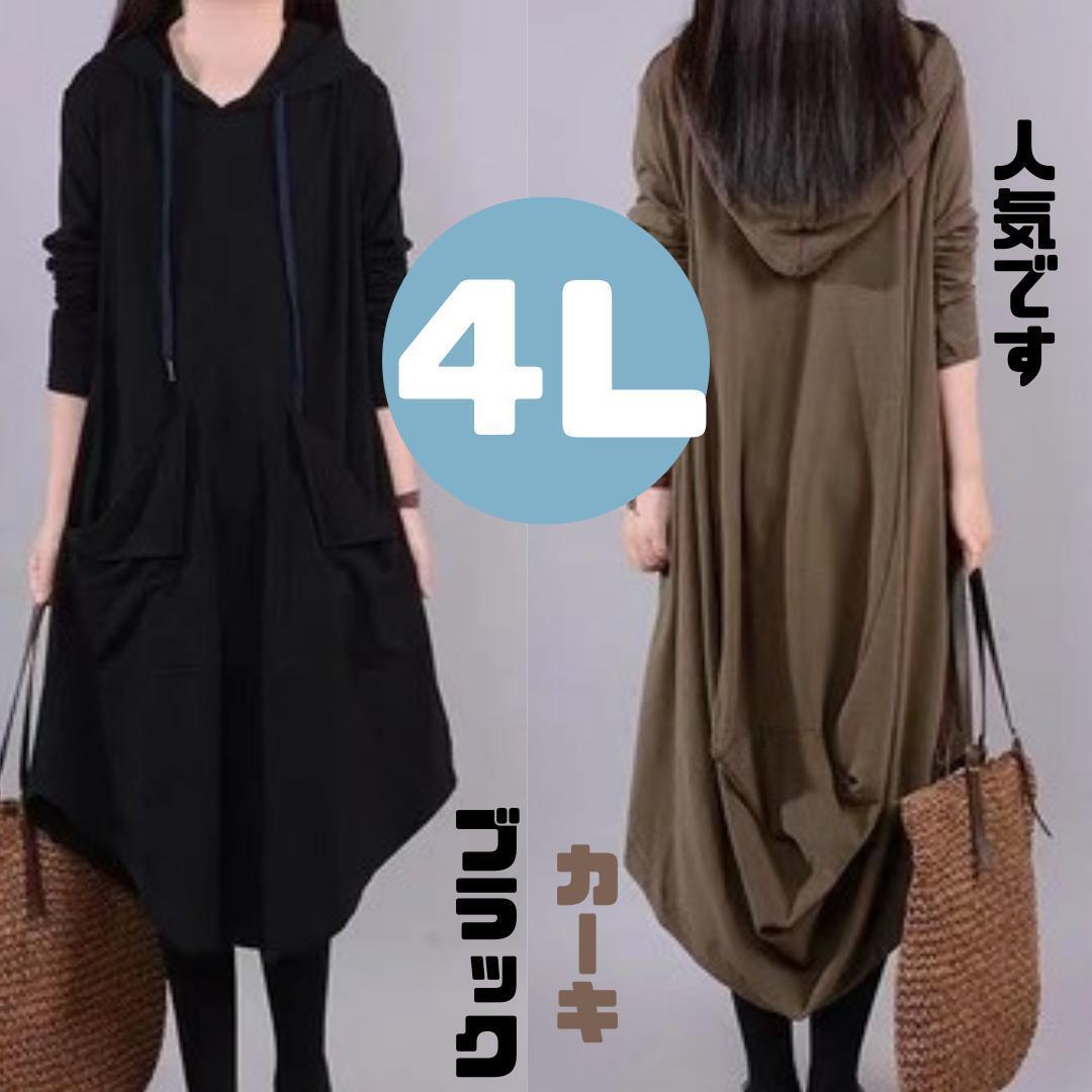 フード付き ワンピース 4L ブラック 大きいサイズ 春 夏 長袖 ブラック 黒 大きいサイズ ワンピース フード