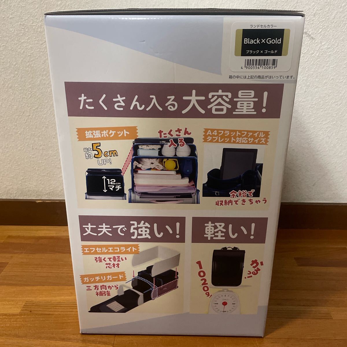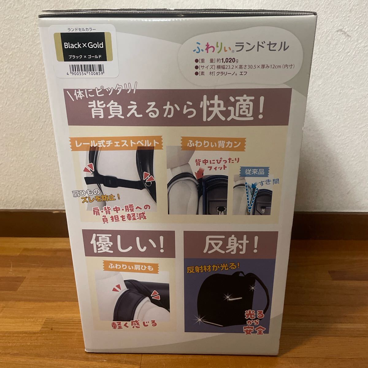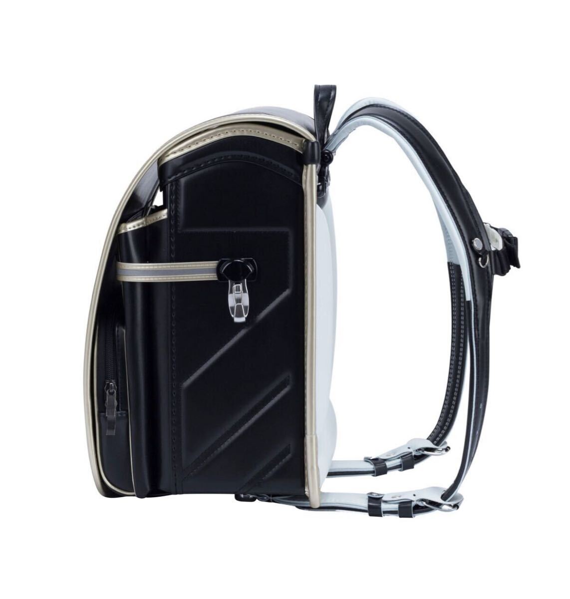 黒とゴールドのコンビネーションで、クッション性のある背面パッドと調整可能なショルダーストラップを備えたシンプルで洗練された飽きのこないデザインのランドセル。