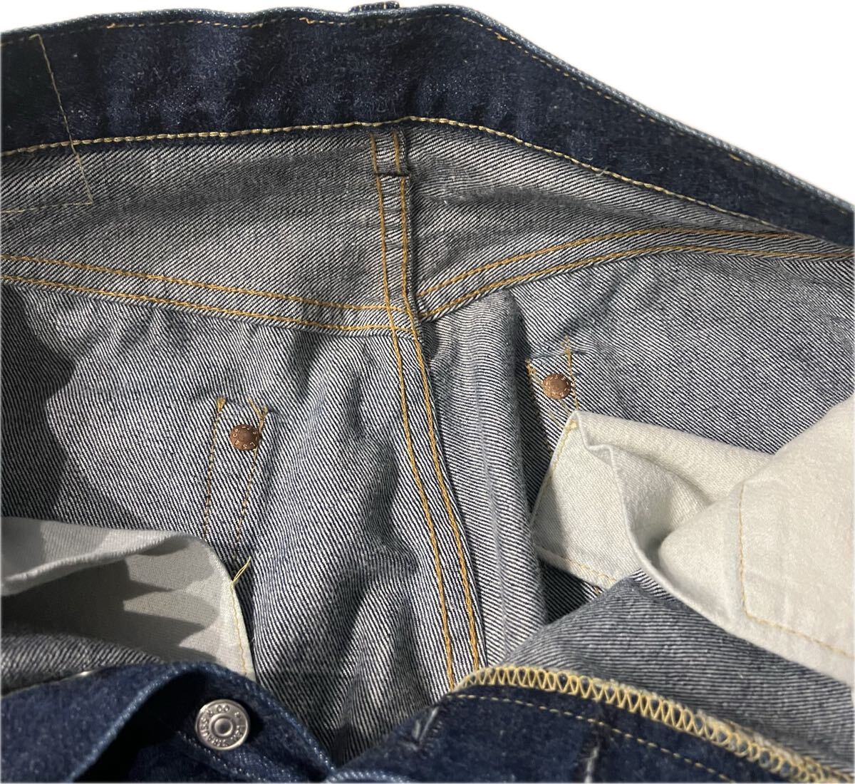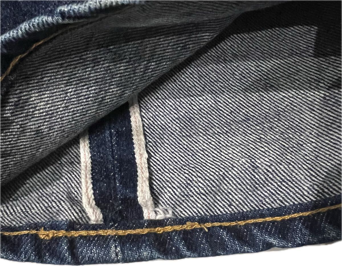 ●フロントはボタンフライ、セルヴィッジは赤耳、バックポケットには隠しリベットがあります。