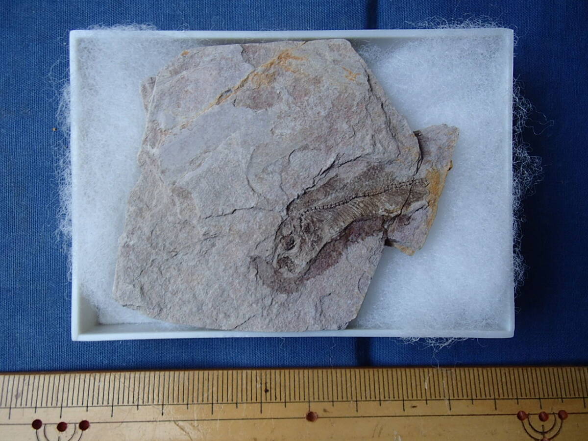 8×55×2㎝のケースに、体調3㎝程の魚化石です。ずっと以前の採集標本ですが、詳しい標本の同定はしていません。ケース込み重さは65グラム、安全のためレターパックプラス600円でのお届けです。他のお買い上げ標本とまとめての場合など、ゆうパックご希望の場合は改めて送料お知らせいたしますので、その由ご連絡ください。