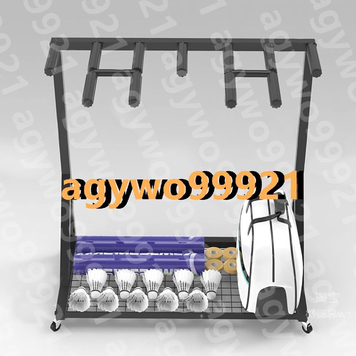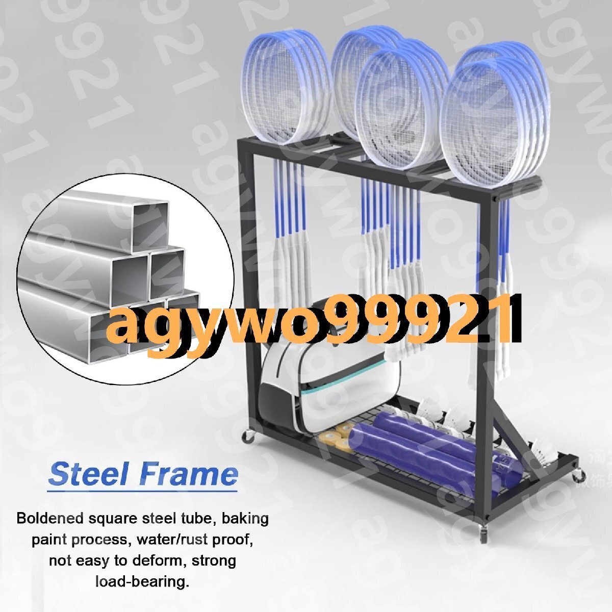 バドミントンラケット収納ラック、モバイルバドミントンラケットディスプレイ収納ラック、25~30本子供大人テニスラケットオーガナイザーカートブラックスチールフレーム、ジム/学校/小売店用
