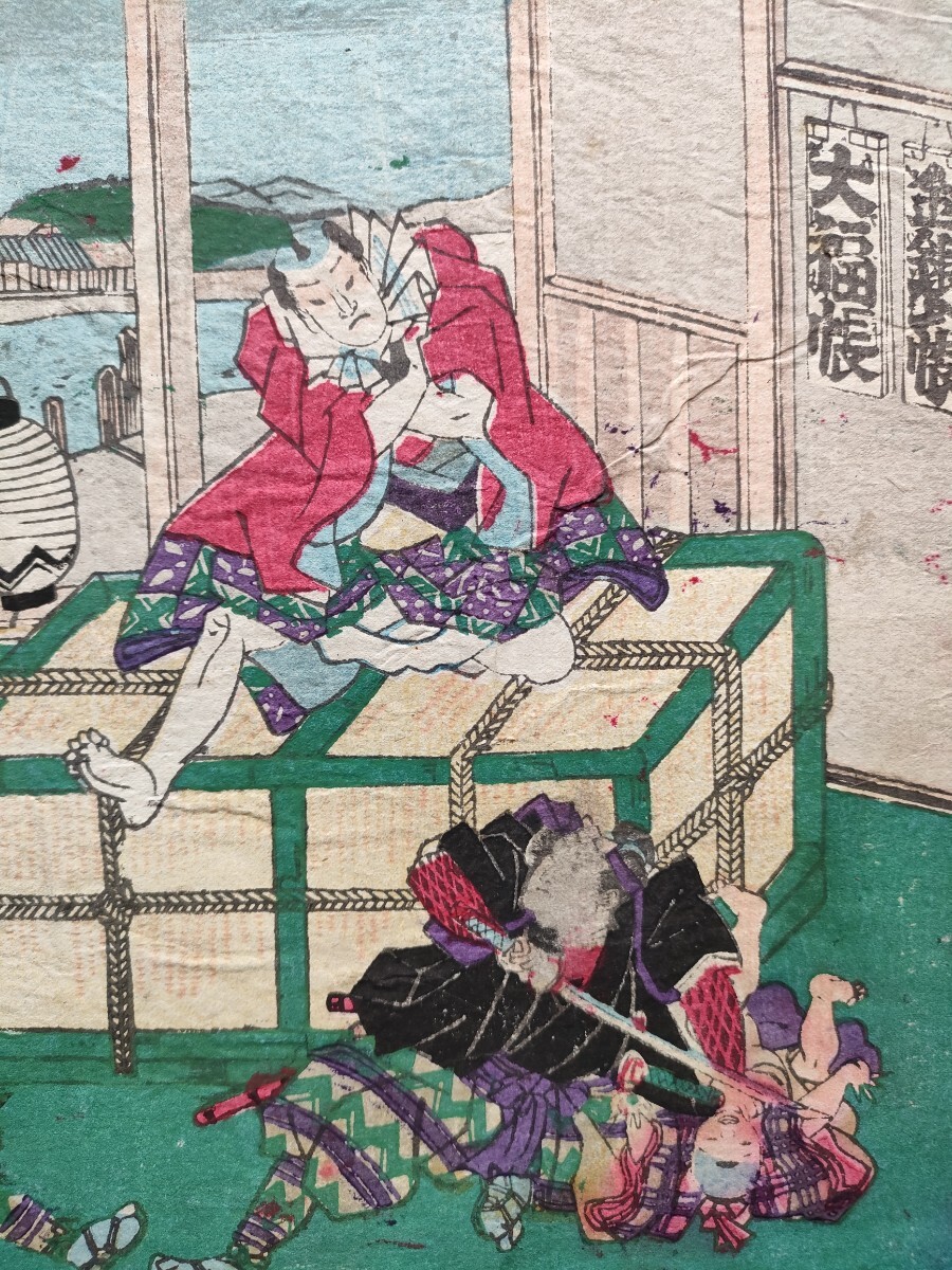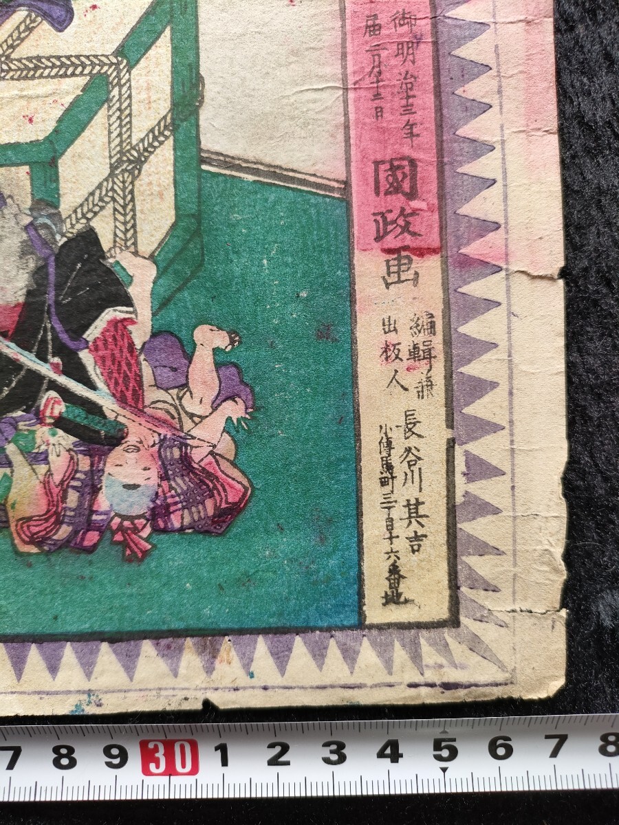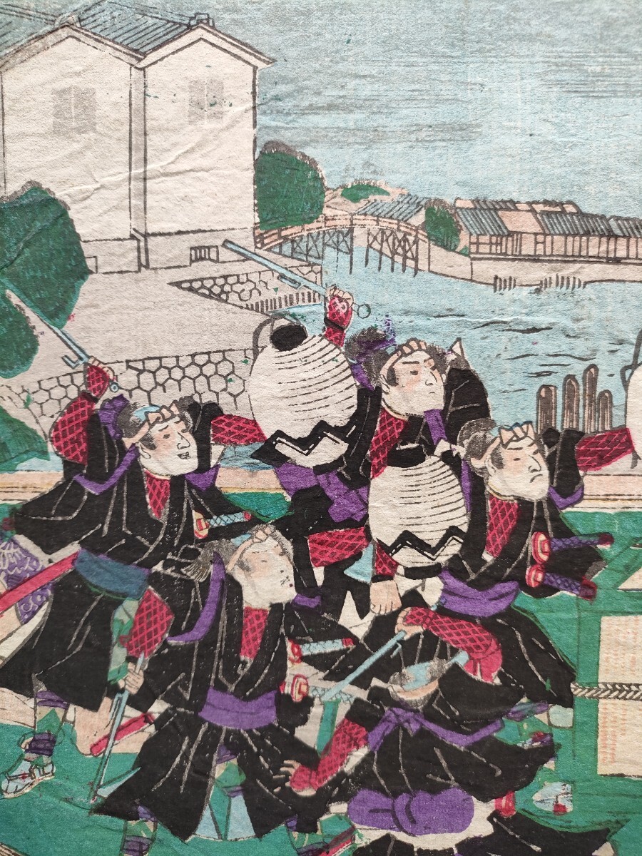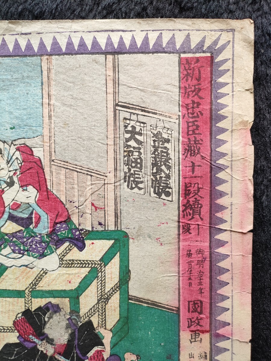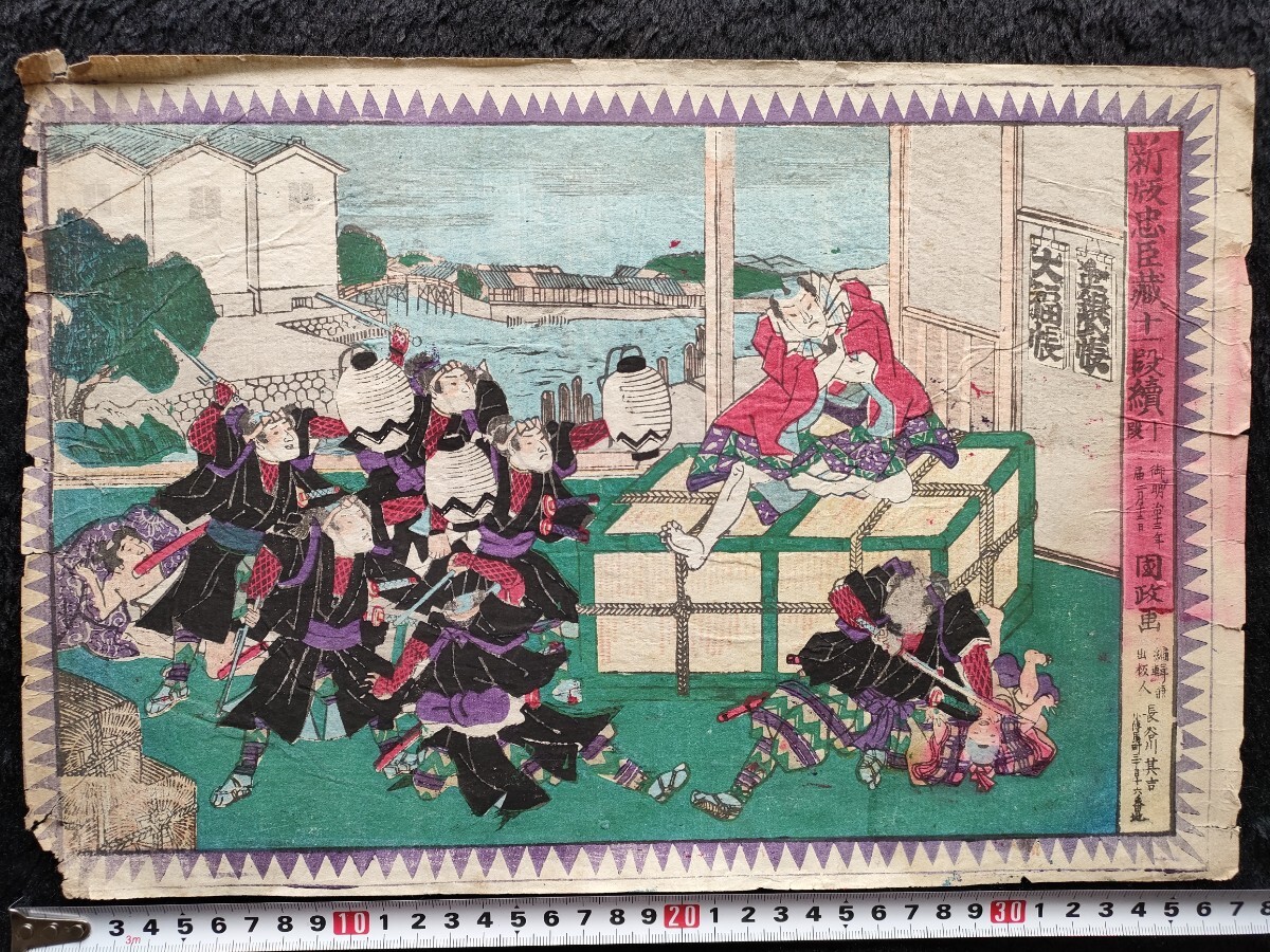 明治期/真作 歌川国政「新版忠臣藏十一段続 十段」本物浮世絵木版画 武者絵 錦絵 大判