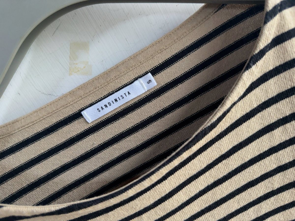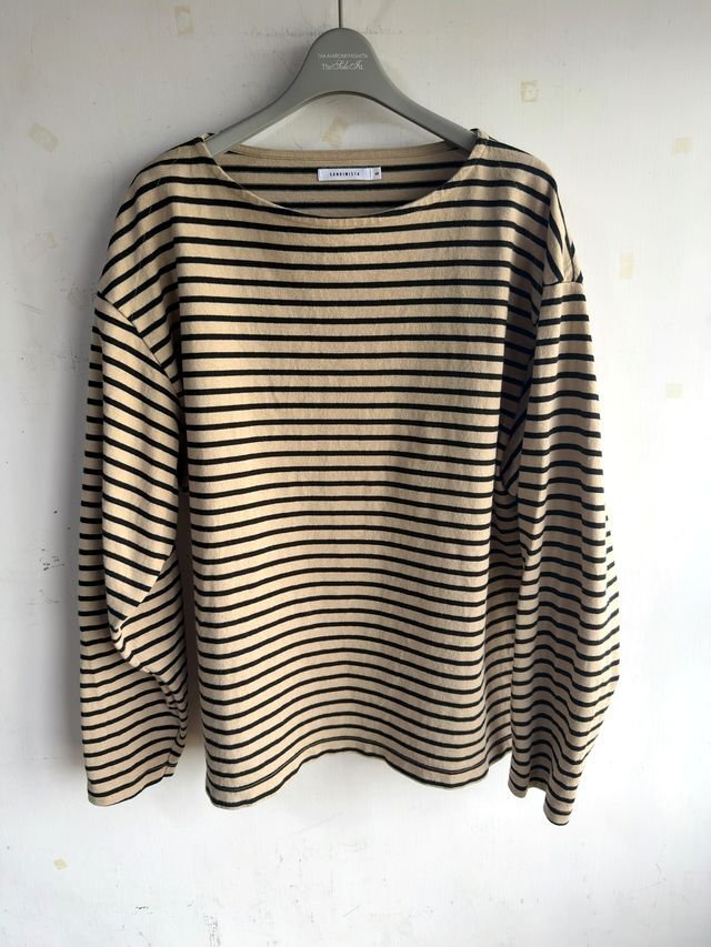 製品染めを施したボートネック長袖Tシャツ 肩部分に補強の裏あてを付けています。 |