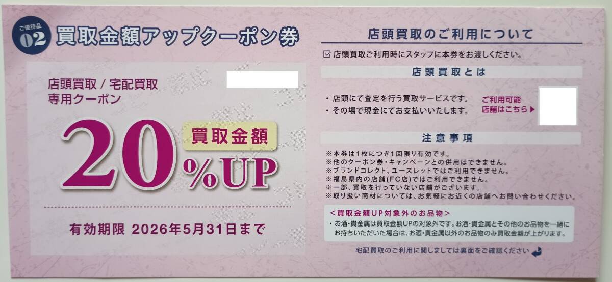 商品説明 | トレジャーファクトリー 株主優待券 買取価格20%UP券 有効期限 2026年5月31日 優待内容 ・買取成立価格が20%UPとなります。 ・トレジャーファクトリーの店舗もしくは宅配買取でご利用いただけます。 福島県内の店舗(FC店)ではご利用できません。 ・他のクーポンとの併用はできません。 入札価格は1枚分の価格です。 3枚まで対応可能ですので必要数をご入札下さい。 |